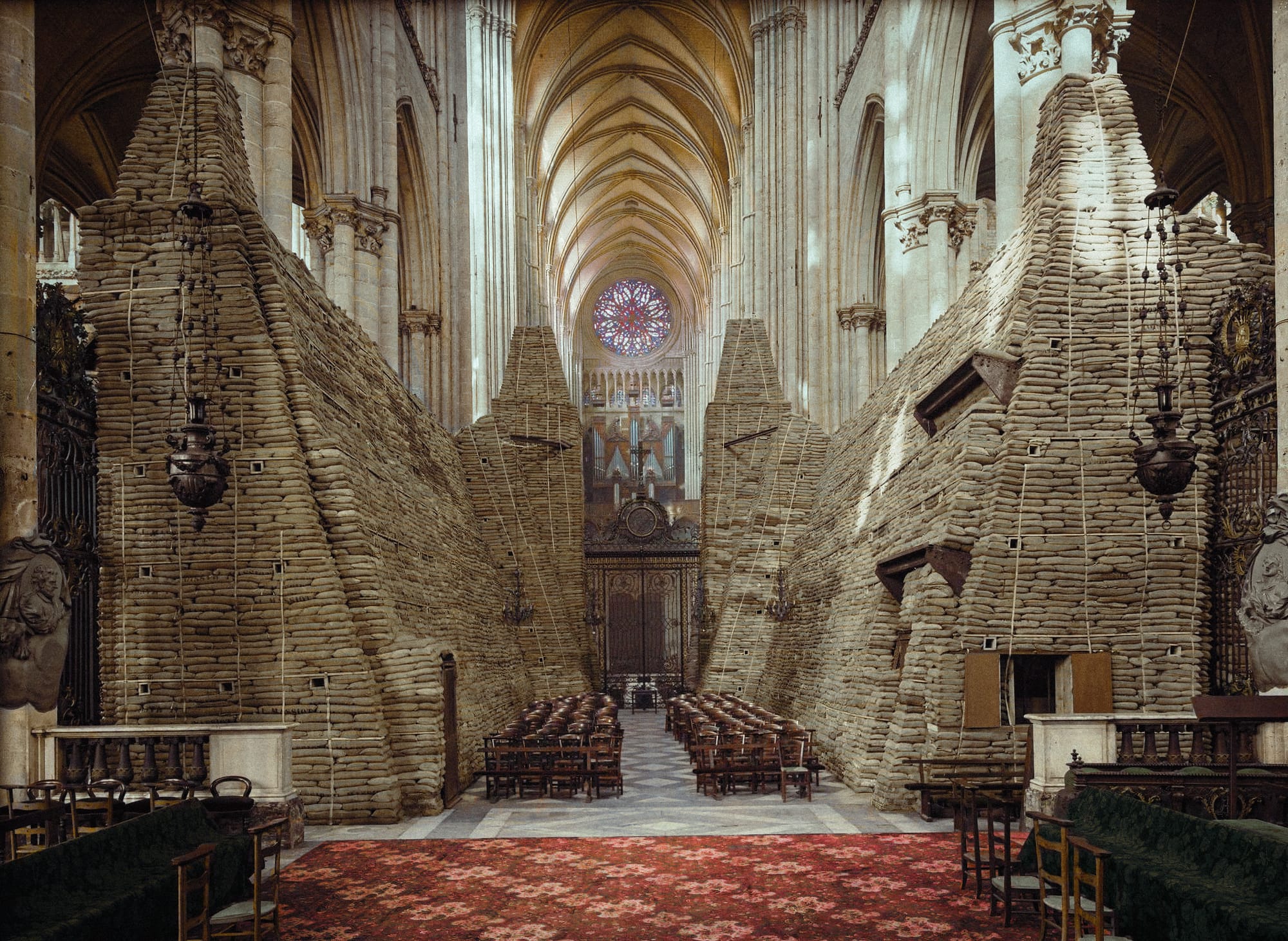 This photograph, taken by an unknown person at some point in 1918 captures the cathedral during this time. The great Gothic columns are crowded with sandbags. The nave, where so many had prayed and worshipped for so many centuries, is empty.