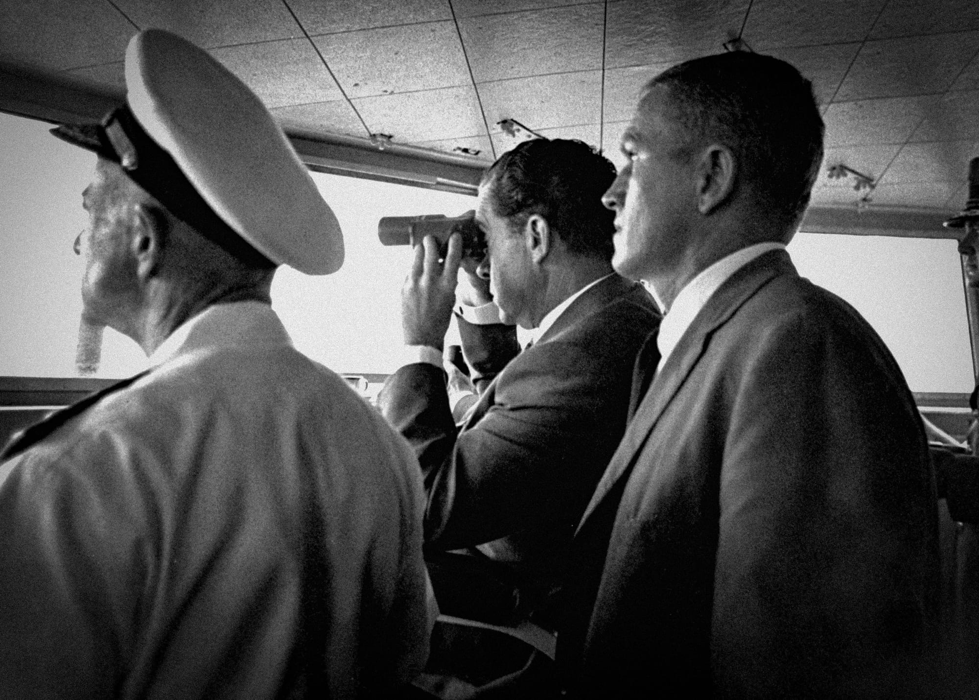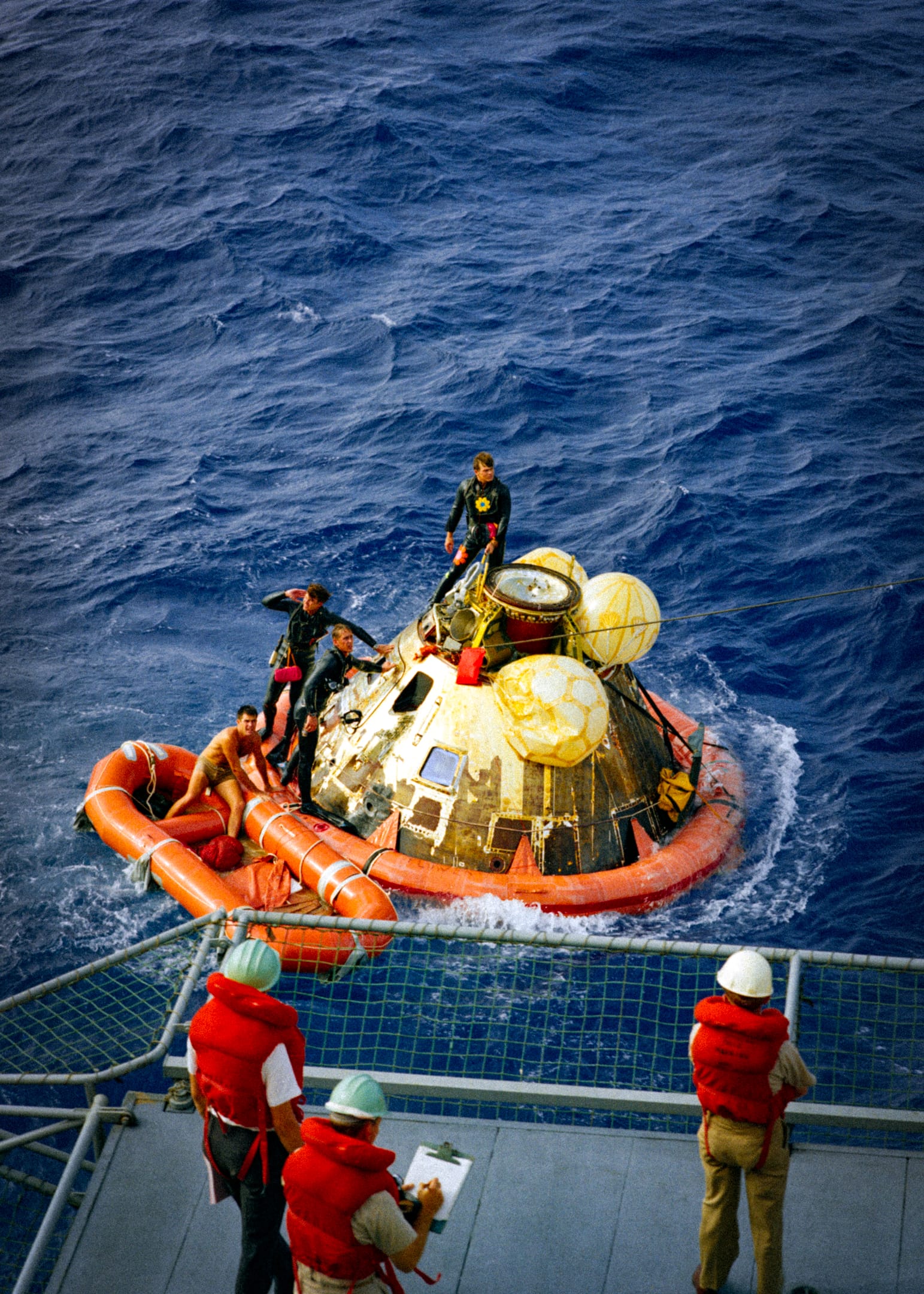 Here he is pictured on USS Hornet, eagerly scanning the horizon for signs of the returning crew. Standing beside him is the astronaut Frank Borman, the commander of Apollo 8.