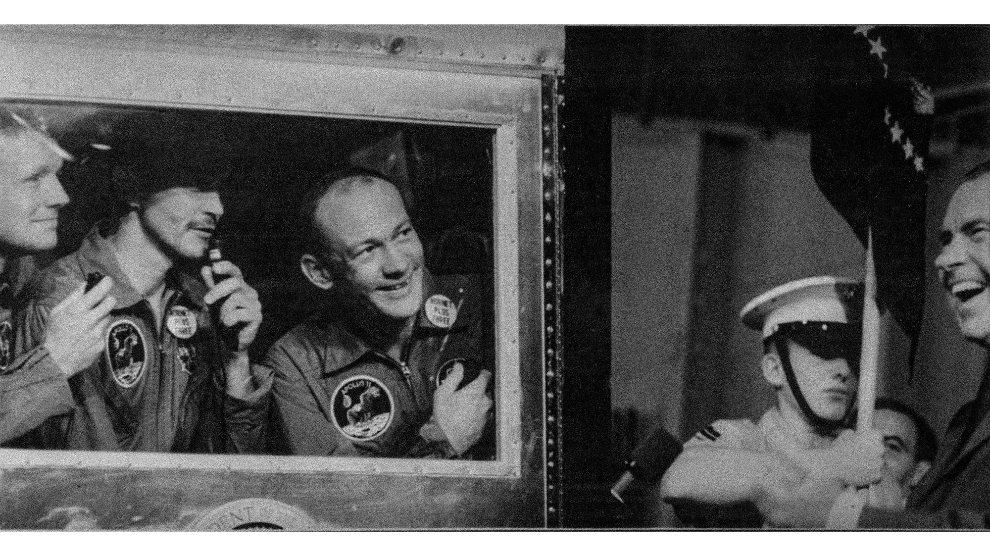 'In a jovial mood he jokes a bit with us, nothing that Einstein’s theory of relativity decress that we have aged a bit less than our fellow earthlings during the days we have been spending in space, and that he has invited our wives – and us – to dinner. He wants to know if we got seasick, and Neil reassures him we did not, speaking over a hand-held microphone as the three of us crouch awkwardly at our low window. Then the President says, ‘This is the greatest week in the history of the world since the Creation ….’ and I lose track of the rest of his speech.