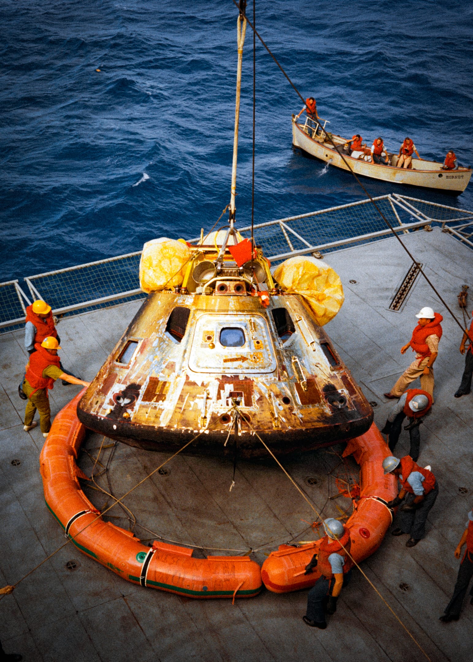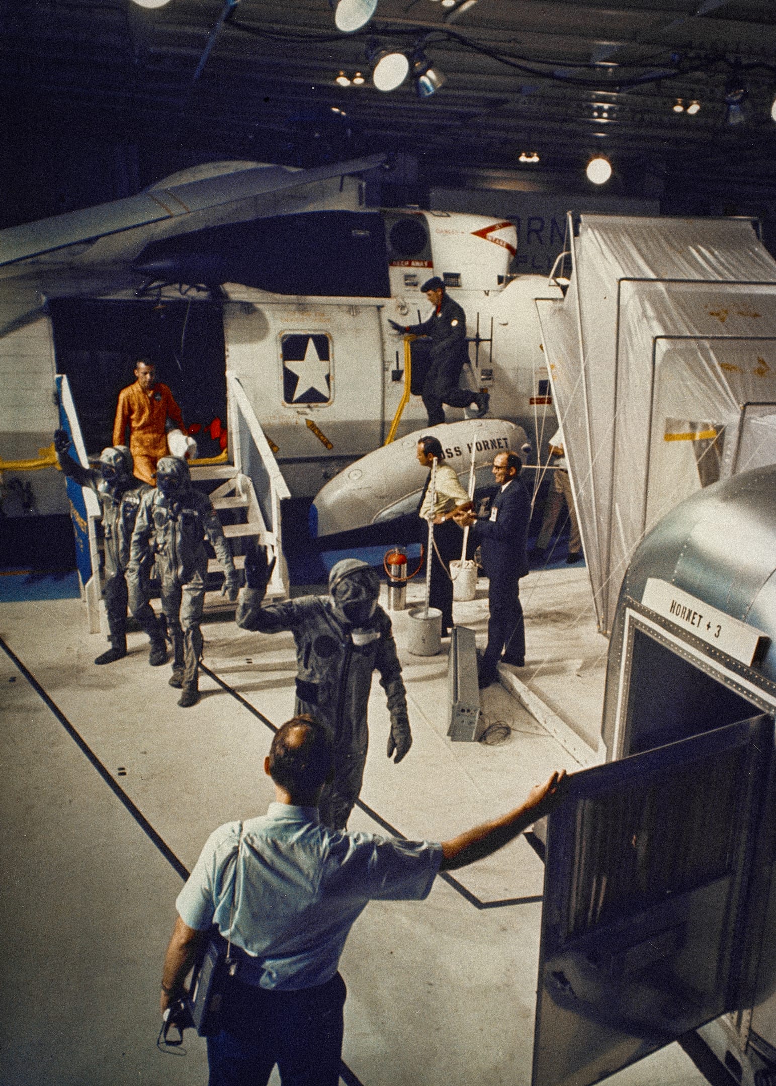 Here he is pictured on USS Hornet, eagerly scanning the horizon for signs of the returning crew. Standing beside him is the astronaut Frank Borman, the commander of Apollo 8.