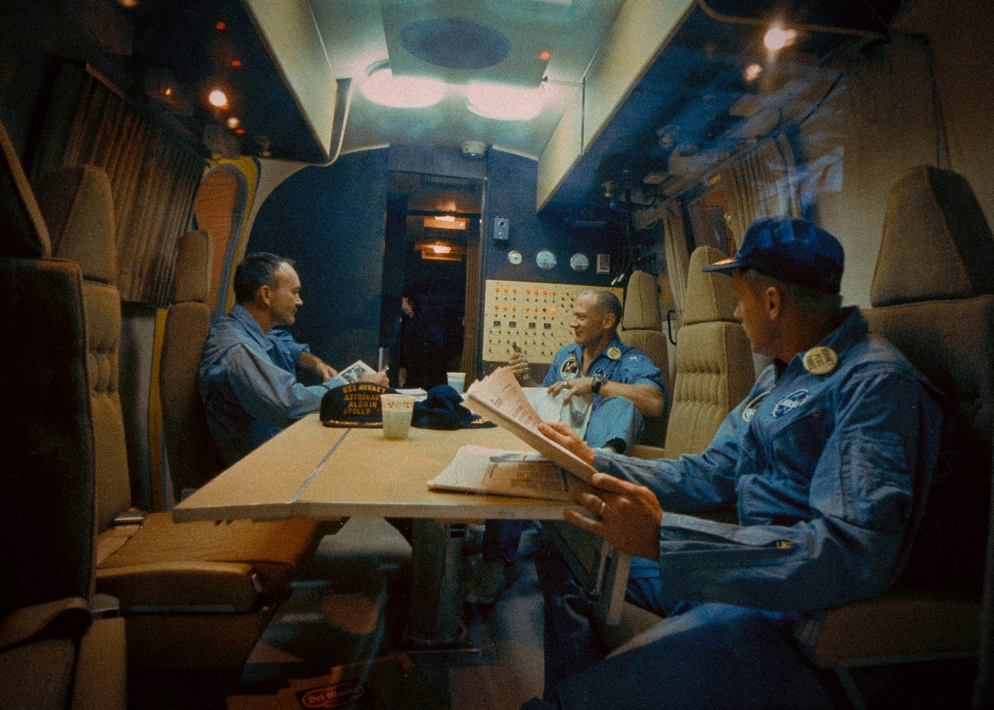 Having been collected from the Pacific Ocean, Armstrong, Aldrin and Collins began their journey back to quarantine. Having been exposed to an unknown environment, a cautious approach was adopted in case they had returned to Earth carrying any lunar bugs.