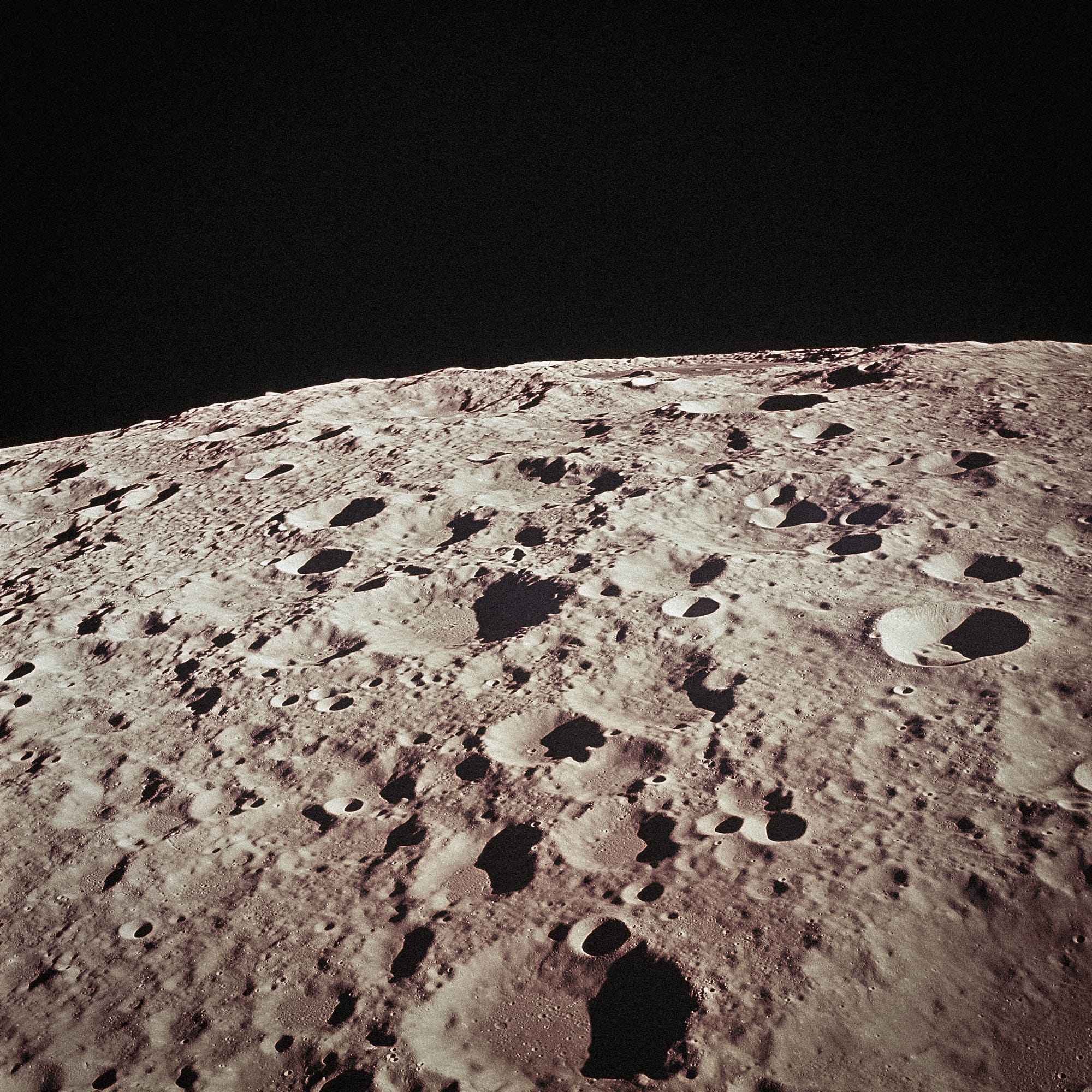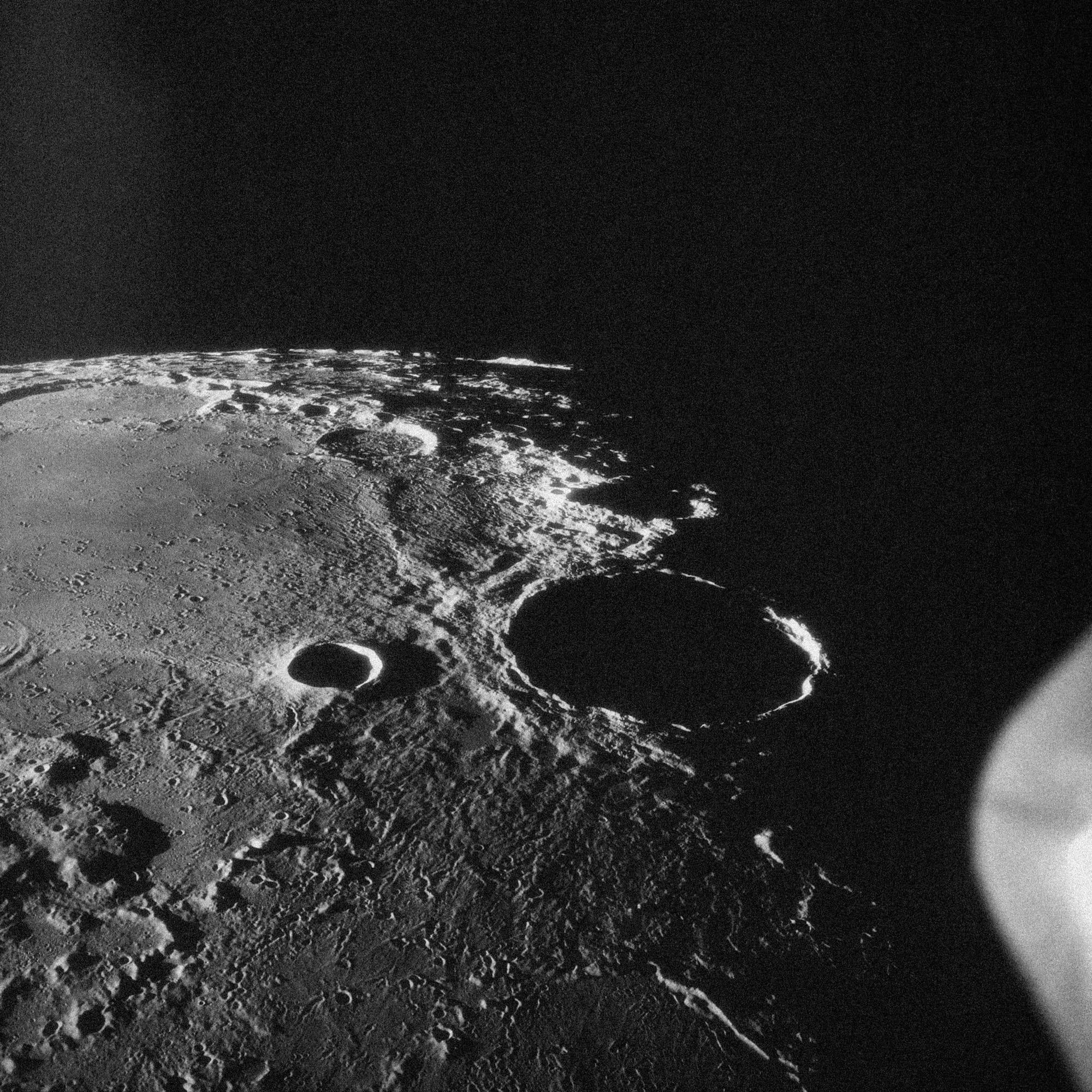 Another important part of Apollo 11's empirical observations was studying the appearance of the mysterious far side of the Moon. This photograph shows this little known area, 'in the vicinity of creator number 308', and it reveals a harsh, pock-marked landscape — one that has suffered the bombardment of millions of years of meteorite strikes.