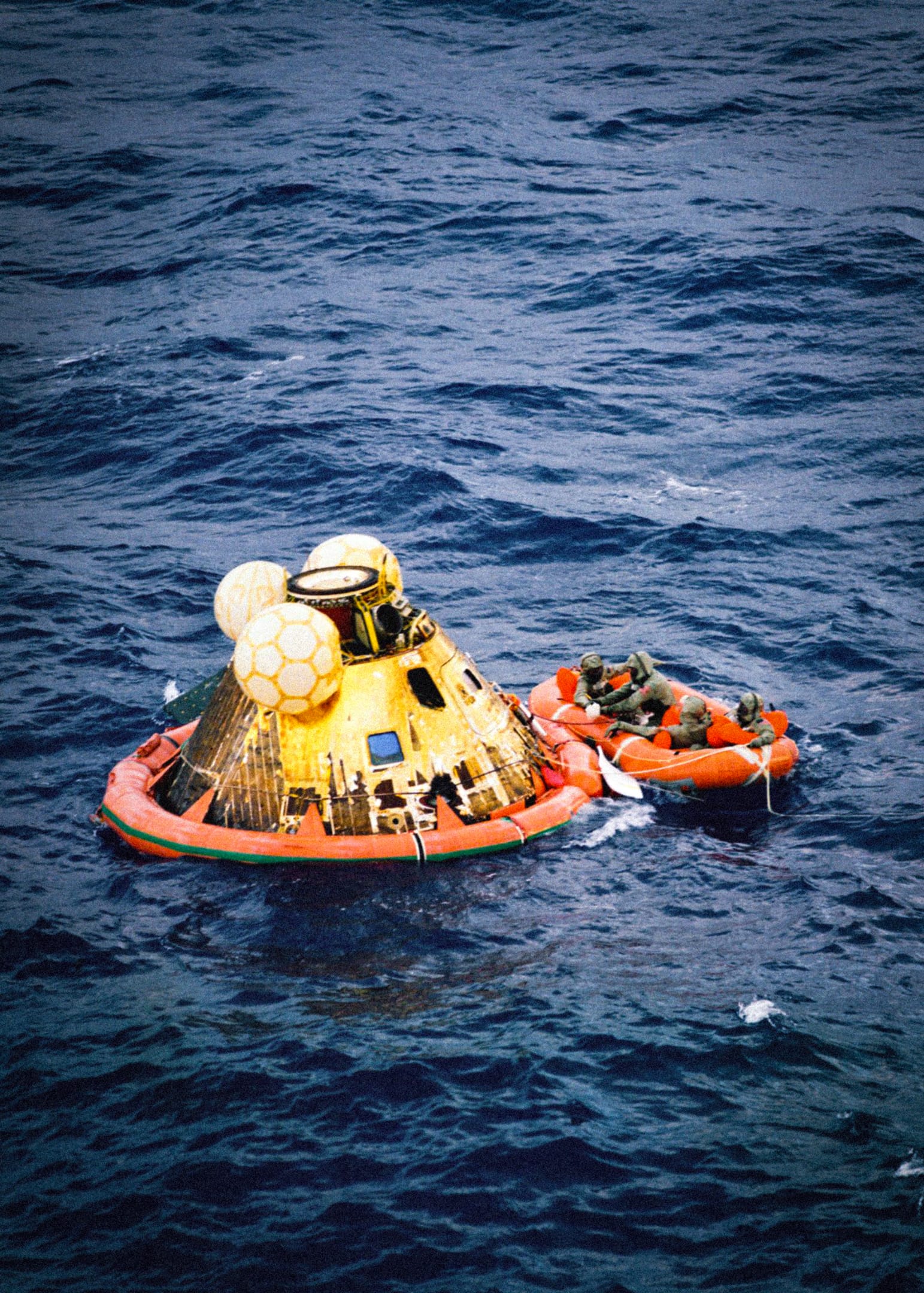 In the early morning of Thursday 24 July, 1969, the small remaining part of Apollo 11 spashed down in the mid-Pacific Ocean. Onboard, safe and healthy, were all three of the astronauts.