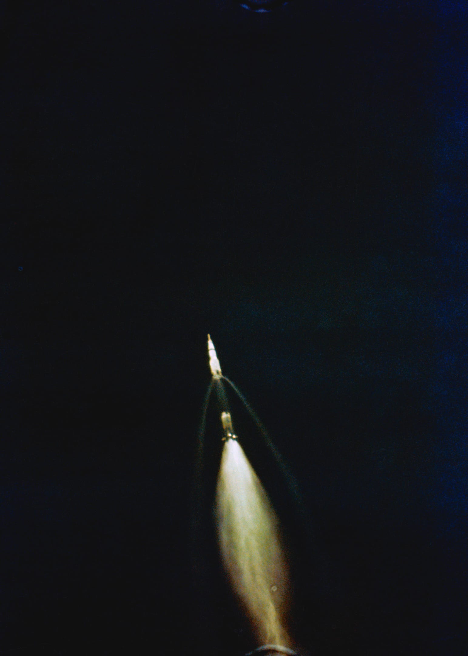 As Apollo 11 arced into the stratosphere, a 70mm tracking camera, mounted on an aircraft, captured this final view of the rocket (left).