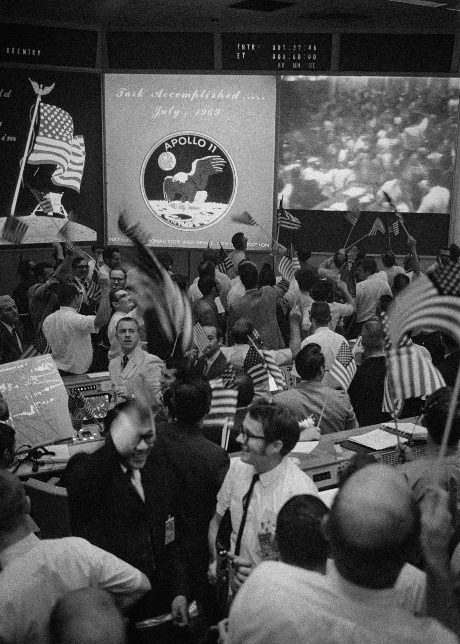 At Mission Control the tension broke as the craft hit the water. Soon the room was filled with people smoking cigars, waving miniature flags, shaking hands and wearing broad smiles.