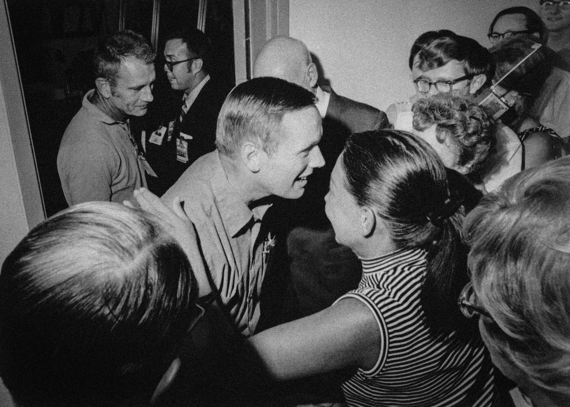 Several weeks would pass before the returning astronauts were allowed out of their mobile quarantine facility. This moment captures a moment of reconnection when Neil Armstrong is welcomed by friends after his release. Behind Armstong you can see the domed head of Robert Gilruth.