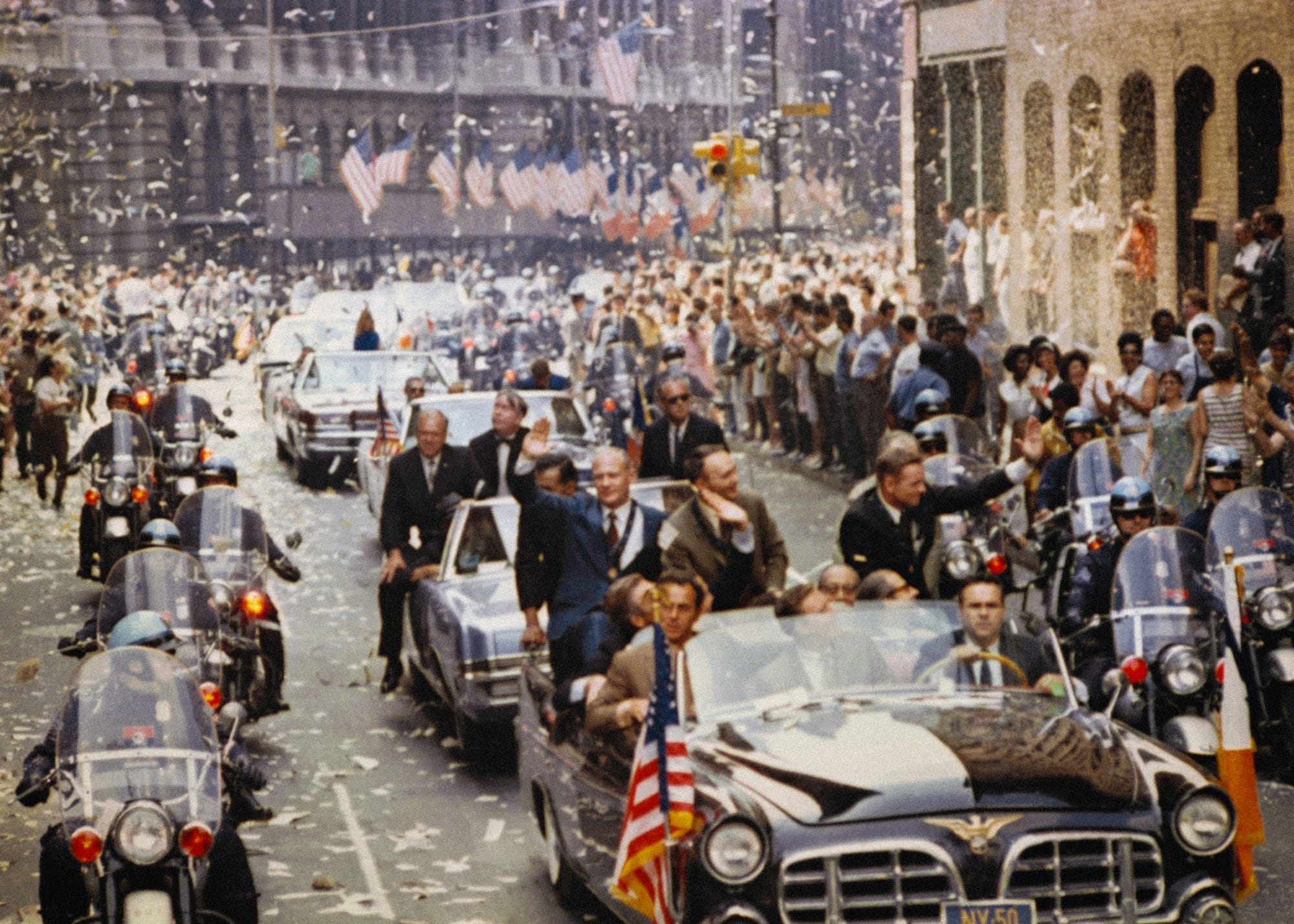 'Showered with tickertape and confetti so thick it was like a snowstorm in August, Apollo 11 astonauts Neil A. Armstrong, Edwin E Aldrin and Michael Collins followed the route of America’s heroes through New York City’s financial district and up through Broadway.