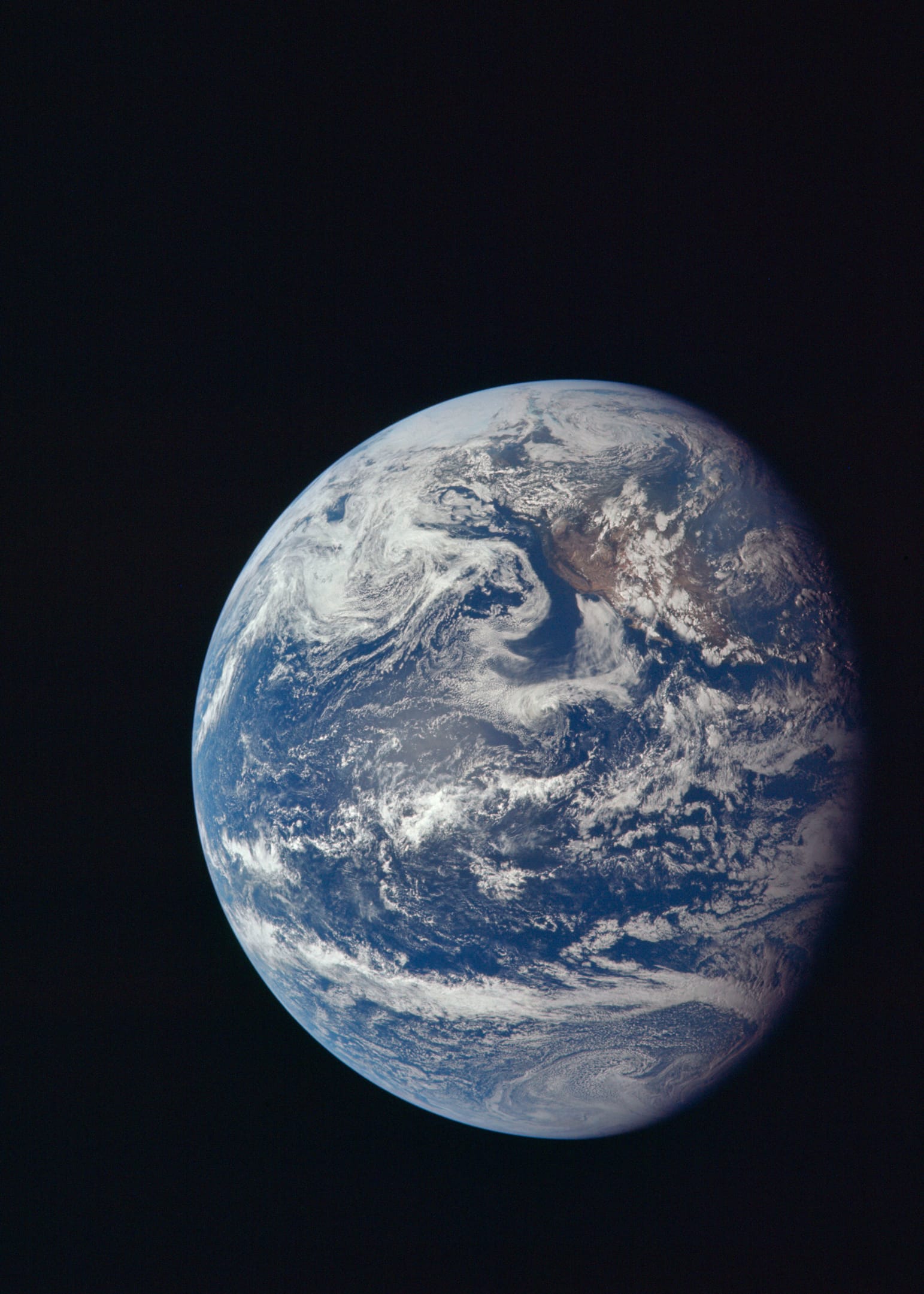 The astronauts were struck by the vivid nature of the colours Earth emitted. The blues of the oceans, greens of the forests and whites of the clouds contrasted strongly with the blackness of space.