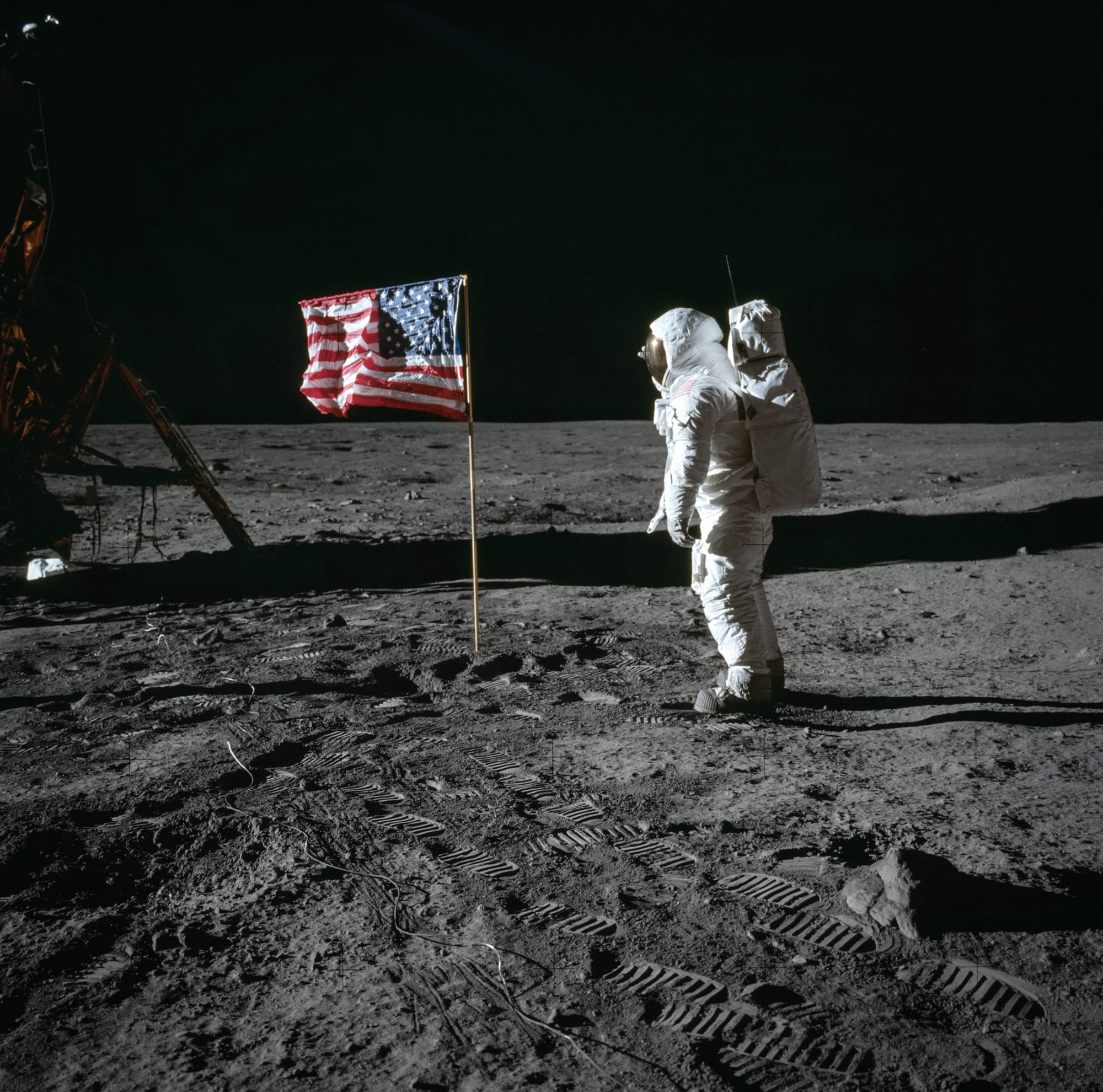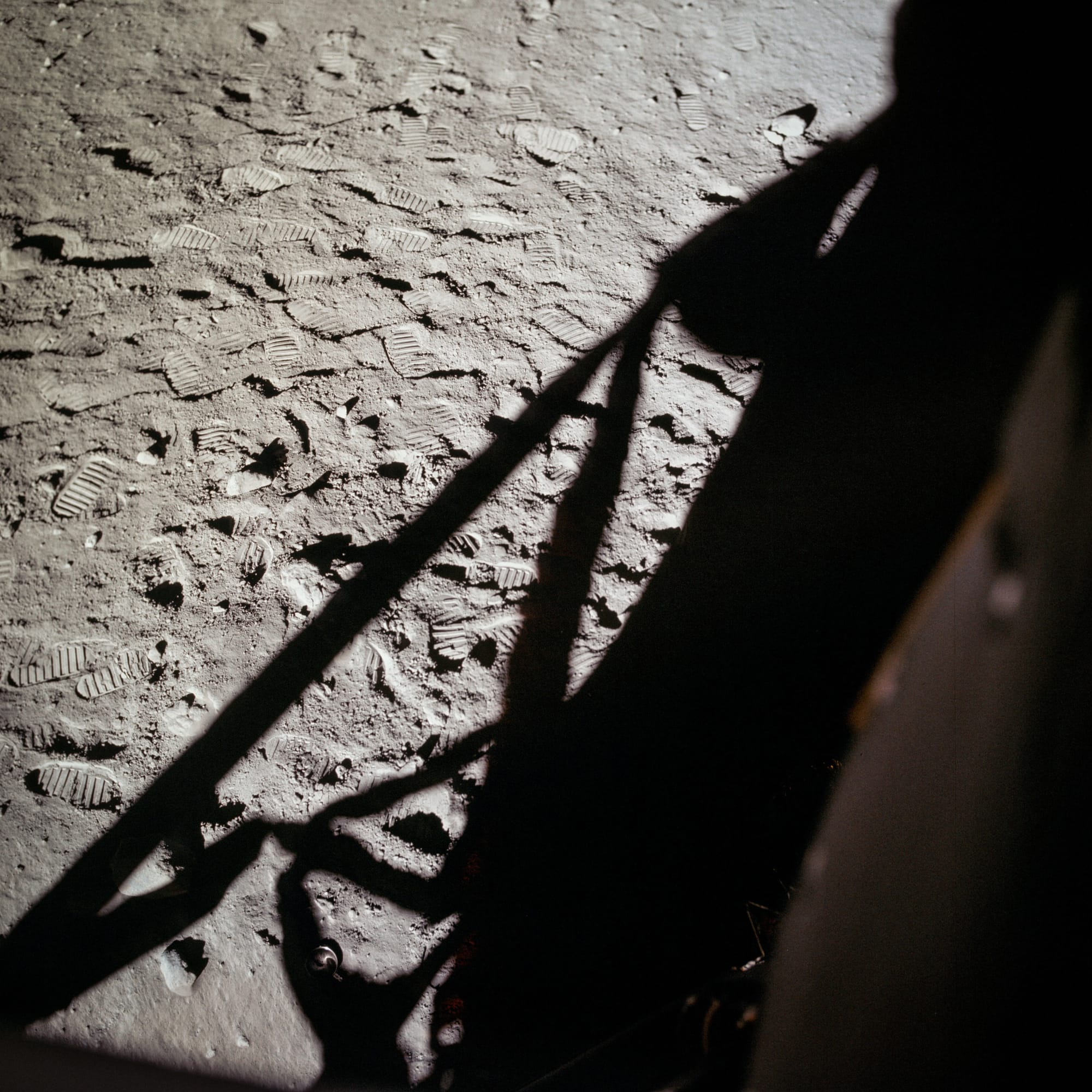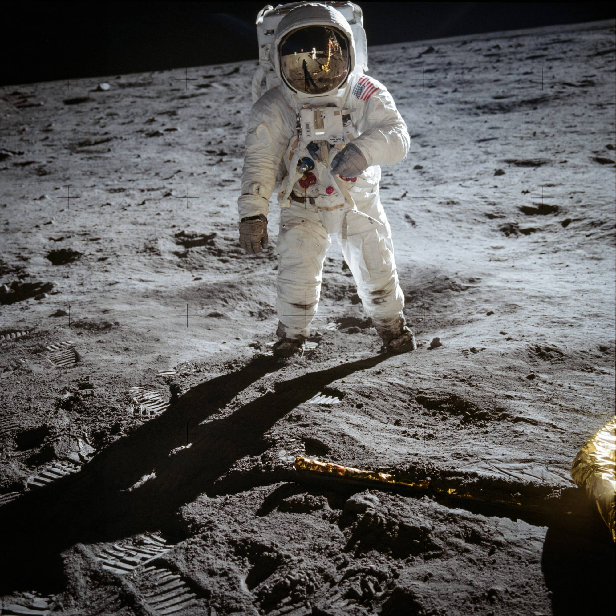 These photographs of Armstrong and Aldrin are among the best known from the Apollo 11 mission. Armstrong's face in particular conveys a sense of giddy excitement as he comes to terms with what has just happened.