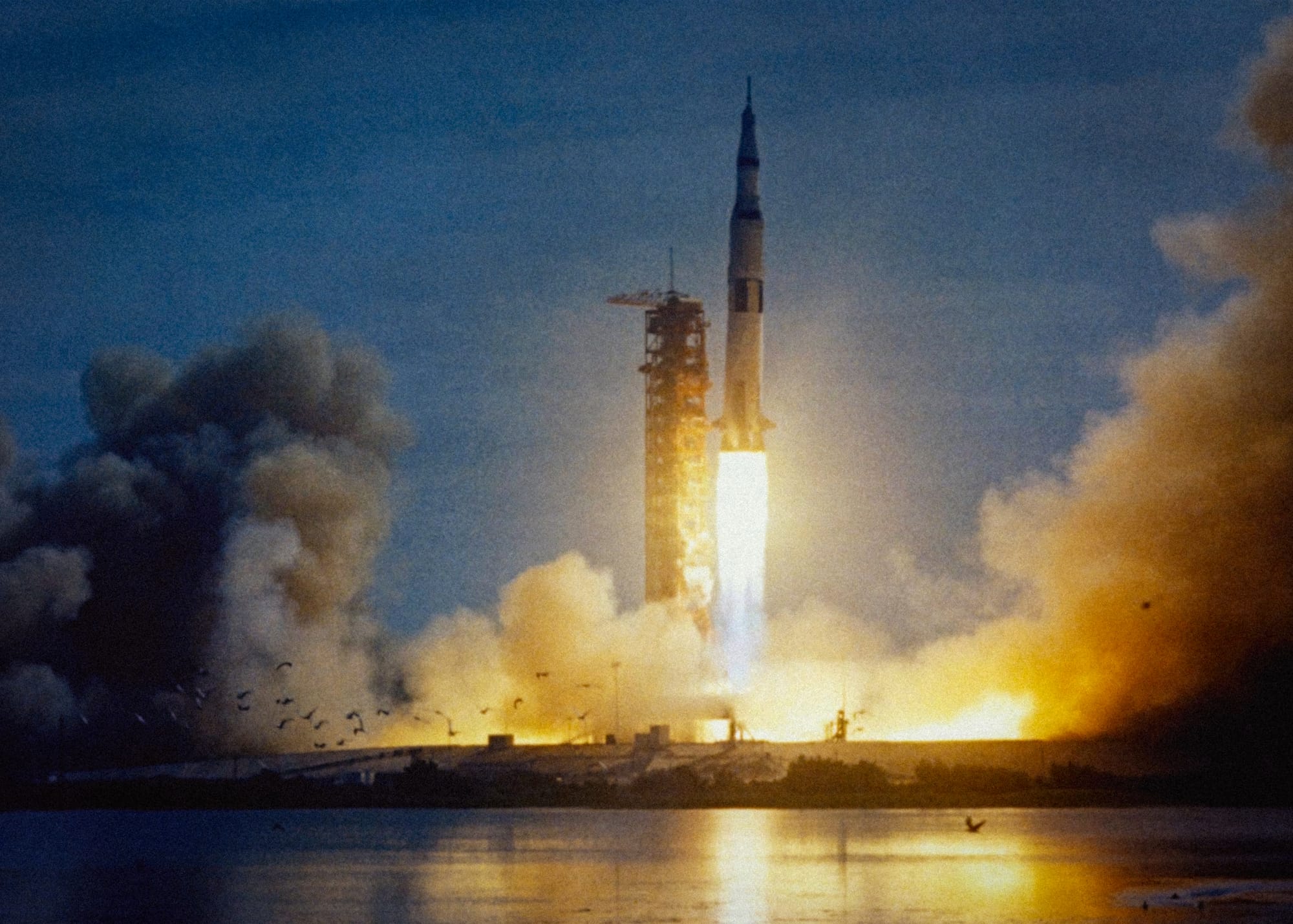 As the 'teeming bird life of the flat Florida coastlands was scattered in fright', the Saturn V rocket vanished into the sky. For all those left on the ground, there was a sense of wonder at the coolness of the astronauts.