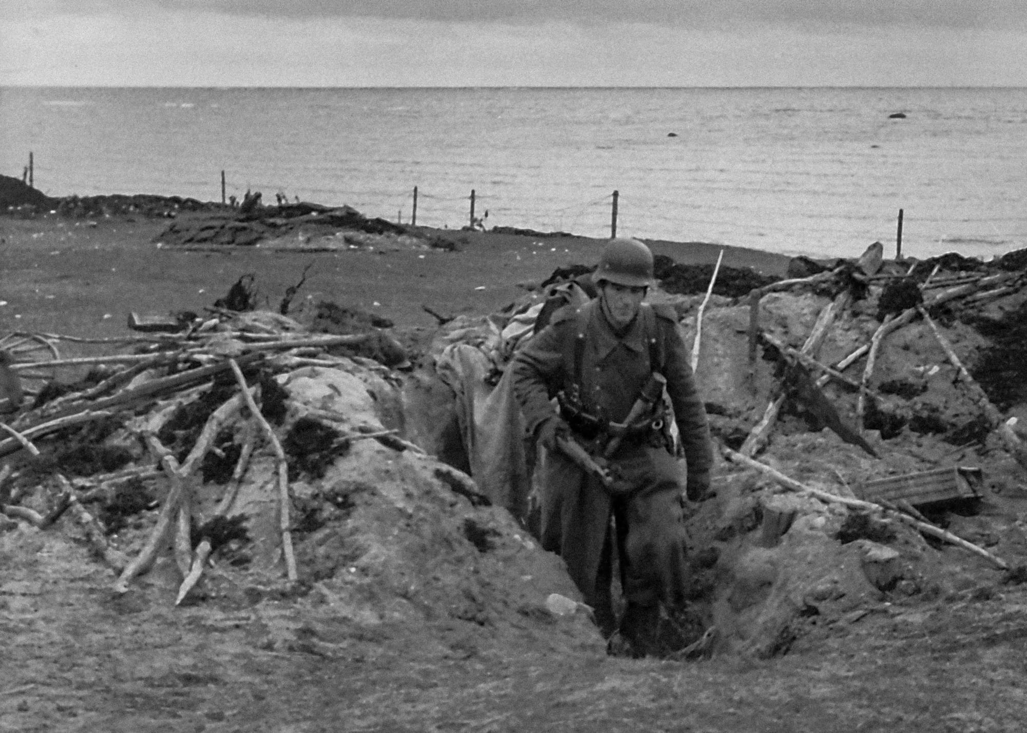 Ian Baxter: This photograph shows a German infantryman emerging from one of their fortified dugouts near positions overlooking the Channel coast between St Martin de Varreville and Azeville in Normandy.