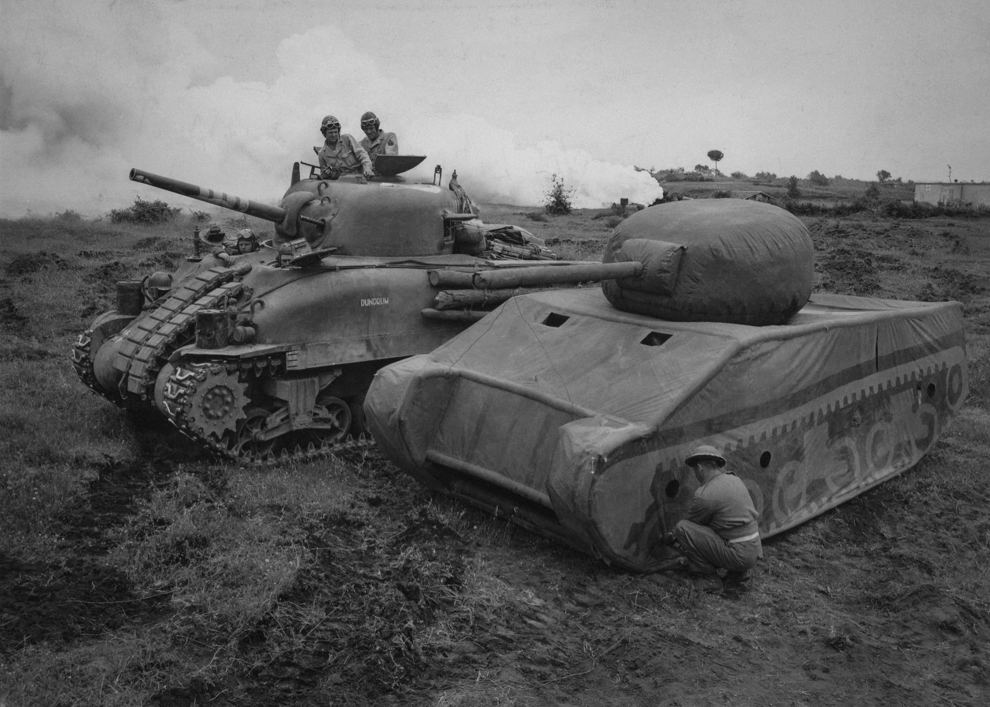 Taylor Downing: The crew of a real US Army Sherman look in amazement as they pass a dummy tank. These dummy tanks were produced in large numbers to be observed and photographed from the air by enemy reconnaissance aircraft. Often lined up in vast assembly areas, the dummies helped convince enemy intelligence that there were more armoured units available than there were in reality.