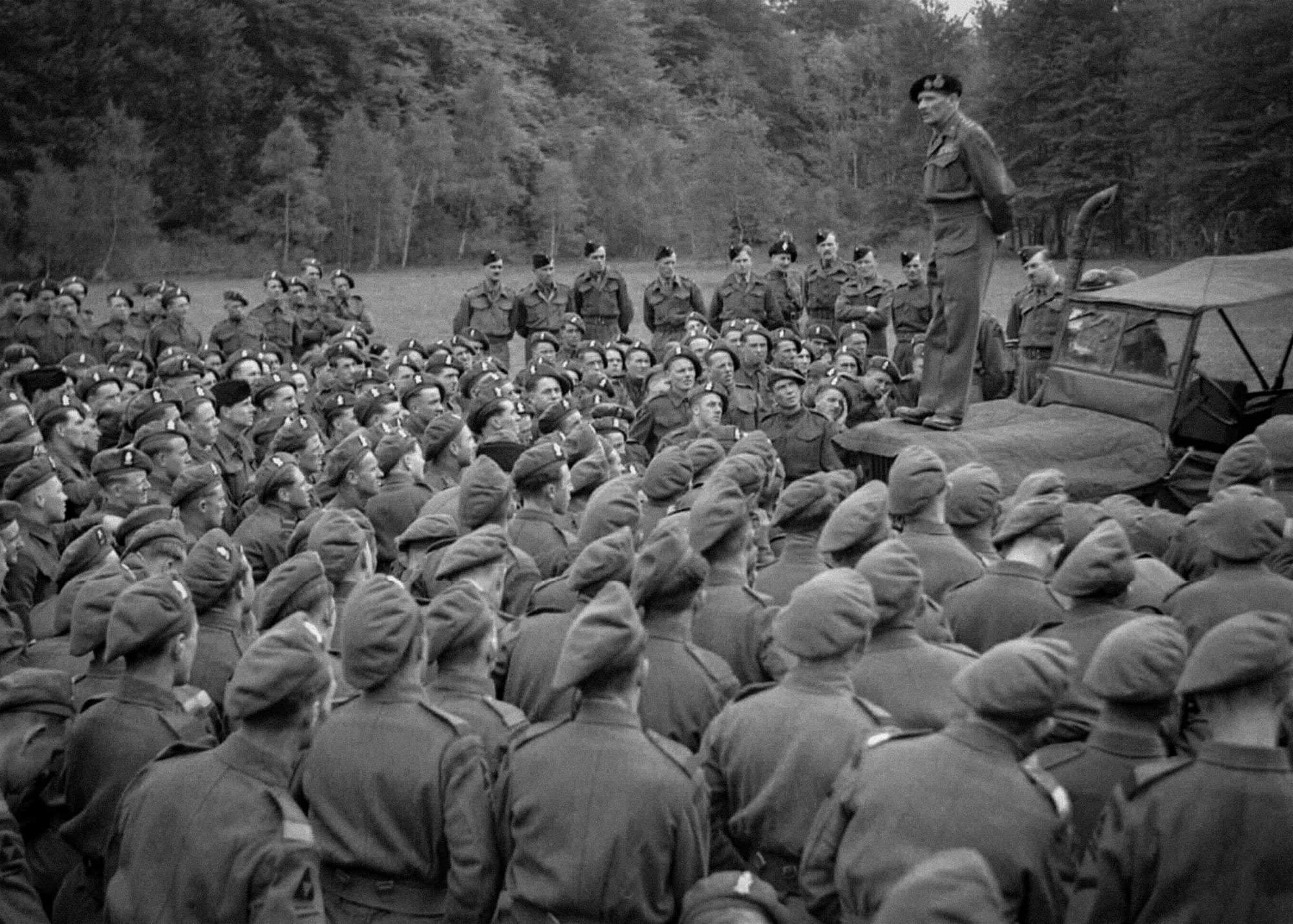I knew this, so I decided, having formed the plan and got it working — got it going — I left it entirely to my staff. And I travelled England and Scotland, showing, talking to the soldiers, and I would talk to twenty thousand at one go. I would go and talk to them, from, standing on the bonnet of a jeep, with a loudspeaker, and then I would say, 'Now, come round me closer. Let's have a look at each other.'