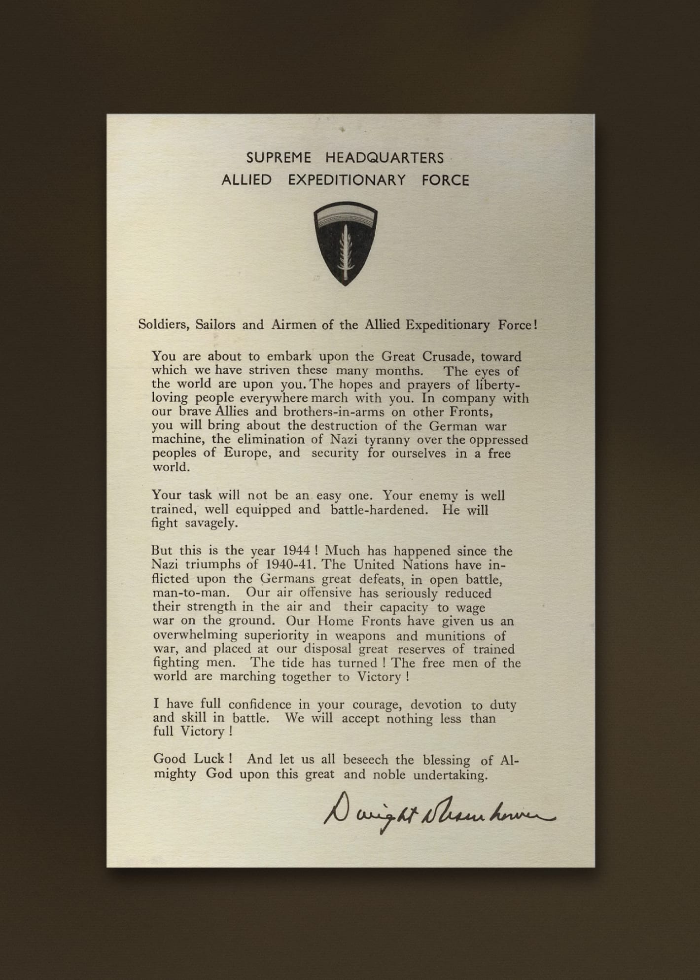 Jordan Acosta: On the eve of the fifth, General Eisenhower’s 'Order of the Day' was distributed to 175,000 members of the Allied Expeditionary Force. It emphasised the invasion’s vital importance, calling it a ‘Great Crusade ... to bring about the destruction of the German war machine.’ The Supreme Headquarters would ‘accept nothing less than full victory’, a promise Eisenhower pre-recorded for radio broadcast after the attack had begun.