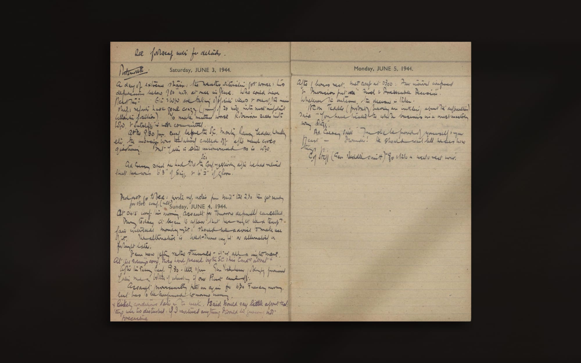 At the 9.30 p.m. conf. before the S.C. [Eisenhower , 'Supreme Commander'] Monty, Ramsey, Tedder, Leigh- Mallory etc. the invasion was tentatively called off after much cross questioning. But Yates is still unconvinced so is W.W.