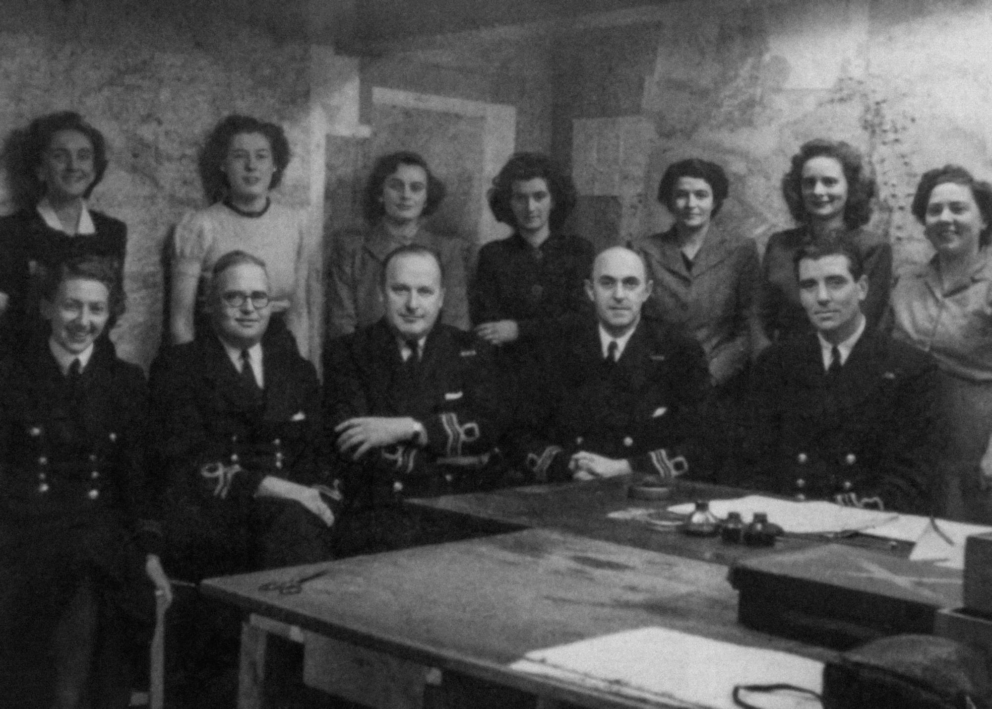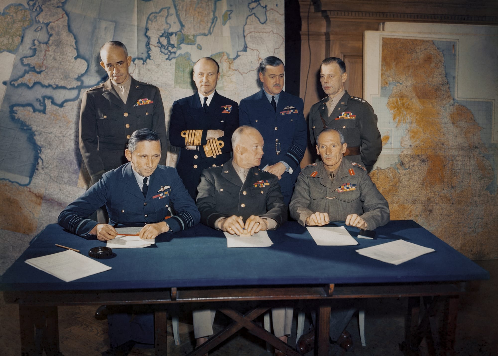 The men consented to pose sitting around a long table and as a group behind a desk. Each photographer managed to take three or four images. The expressions on the faces of some of the group betray a mixture of irritation and boredom; especially Deputy Supreme Commander Tedder, who seems to find it all a bit of a chore.