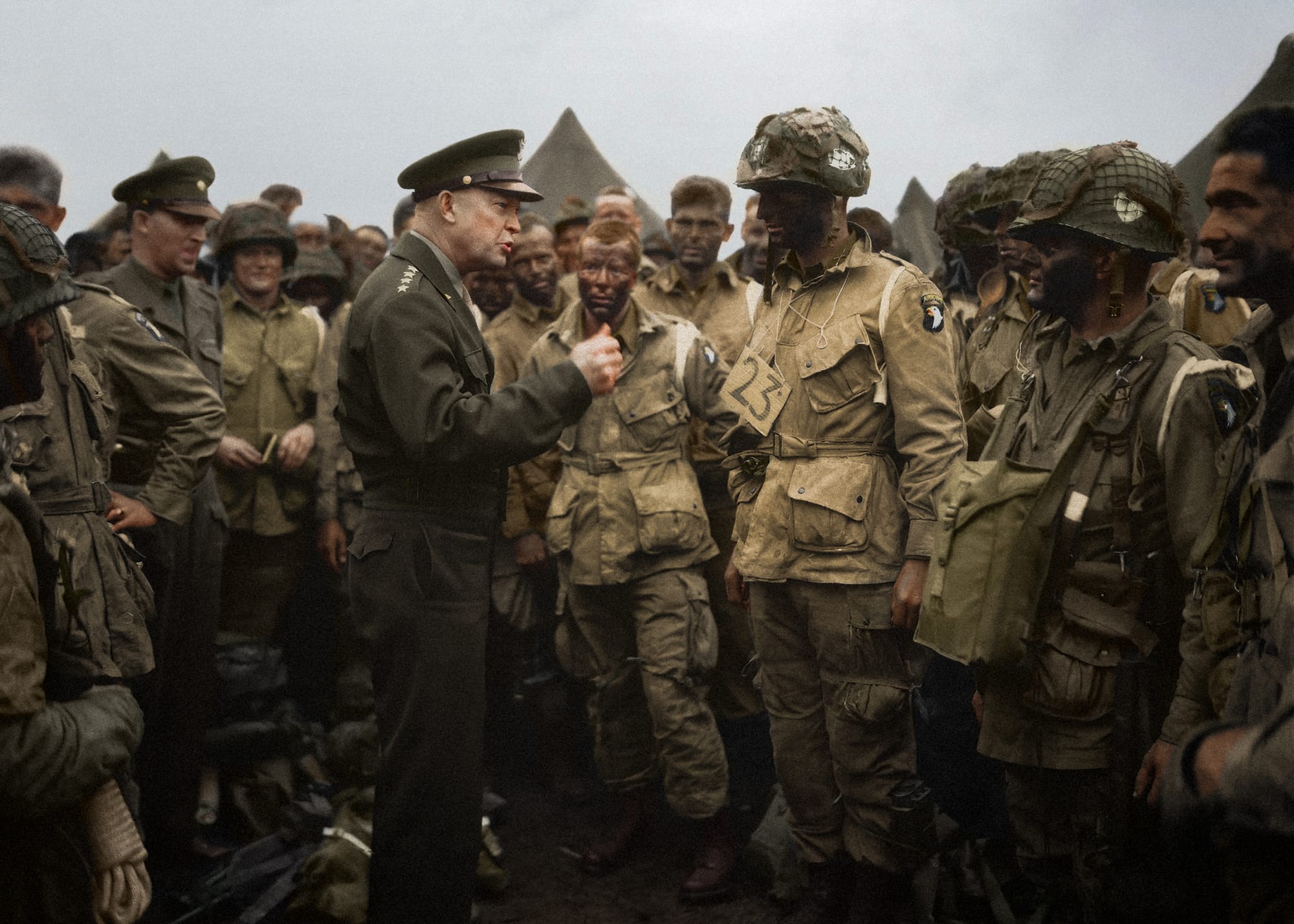 Jordan Acosta: General Eisenhower meets troopers of the 502nd Parachute Infantry Regiment on the eve of the invasion. ‘Ike’, as Eisenhower was known, is captured conversing with 1st Lieutenant Wallace C. Strobel on his 22nd birthday. The 23 sign around Strobel's neck marks him out as 'jumpmaster' of plane #23.