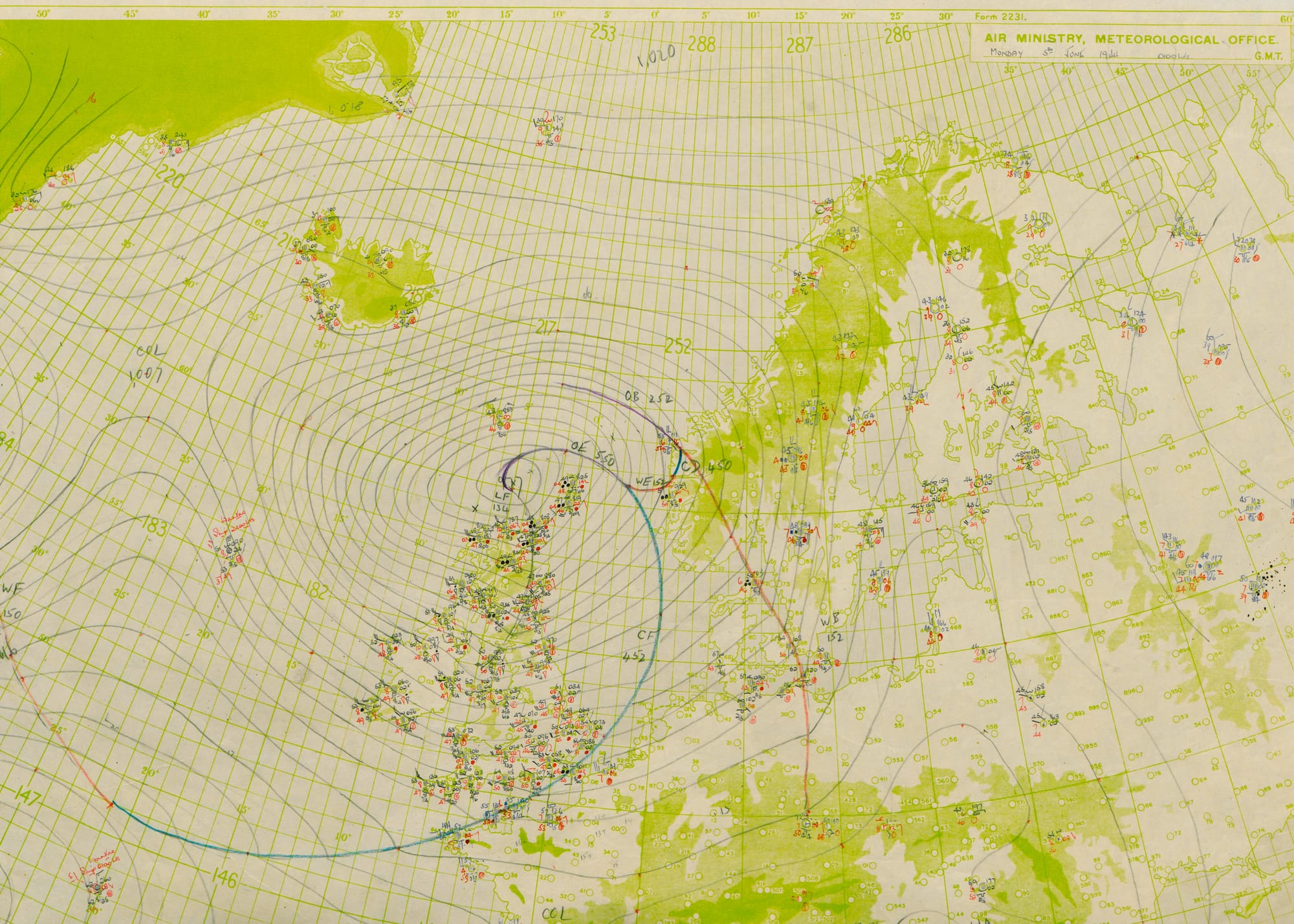 Peter Gibbs: I feel an immediate connection to the meteorologists who drew up this chart from 5 June 1944. As a forecaster starting my career 40 years after Stagg I was drawing those same pencil lines around hand-plotted inked observations decoded from a teleprinter printout.