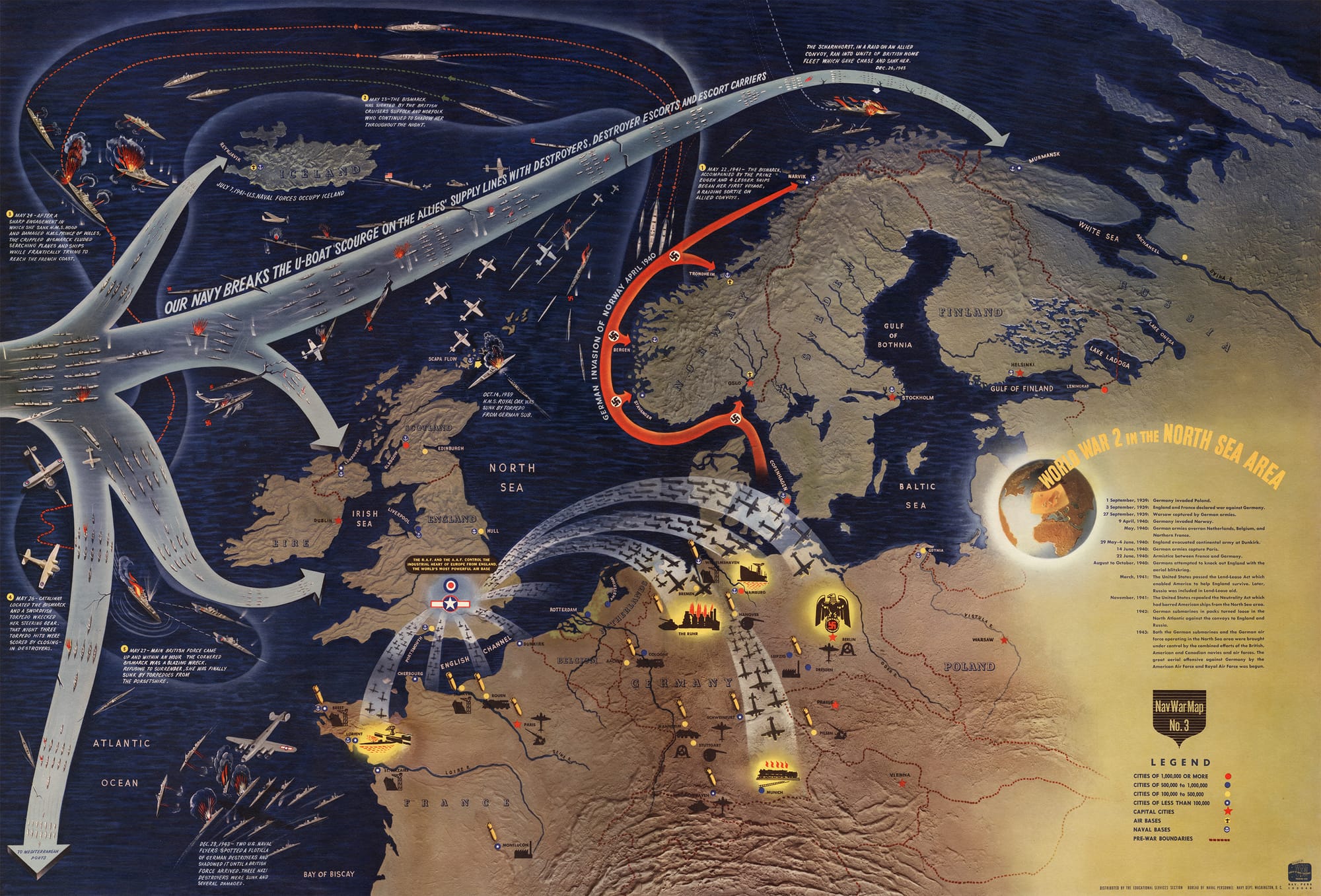 Peter Moore: This map was issued by the US Navy in the months before Operation Overlord. A stylish piece of political cartography, it related a rousing story about the Battle of the Atlantic with the tagline, ‘Our Navy Breaks The U-Boat Scourge On The Allies’ Supply Lines With Destroyers, Destroyer Escorts and Escort Carriers'.