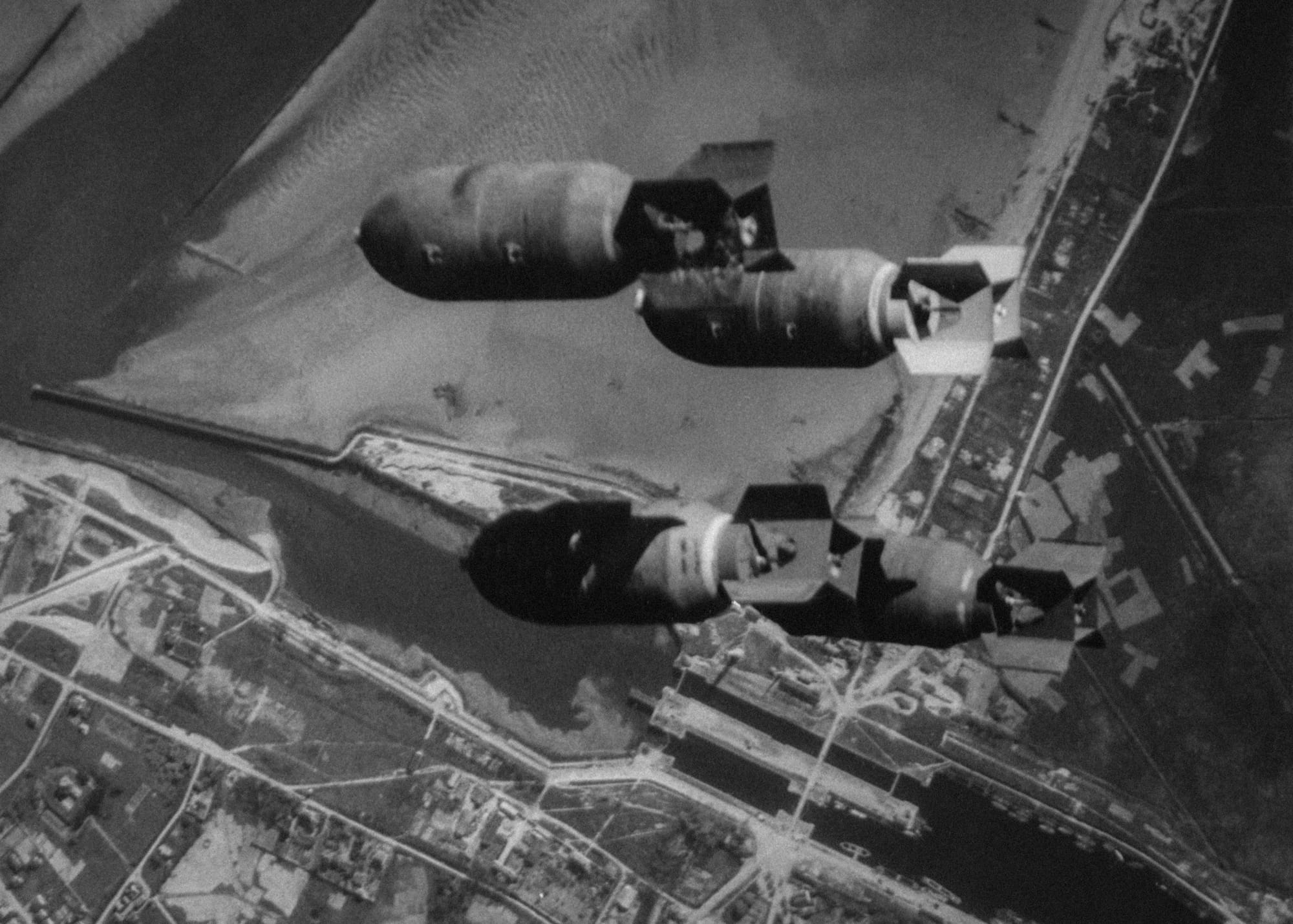 Fortunately the locks were not the target of these bombs, which instead are falling towards the neighbouring German coastal battery (codenamed 'Bass' by the Allies). The regular bombing eventually persuaded the Germans to withdraw the six 155mm guns from the battery until new enclosed casemates had been constructed to protect them. When 4 Commando attacked the site on D-Day they found that the gun pits were empty.