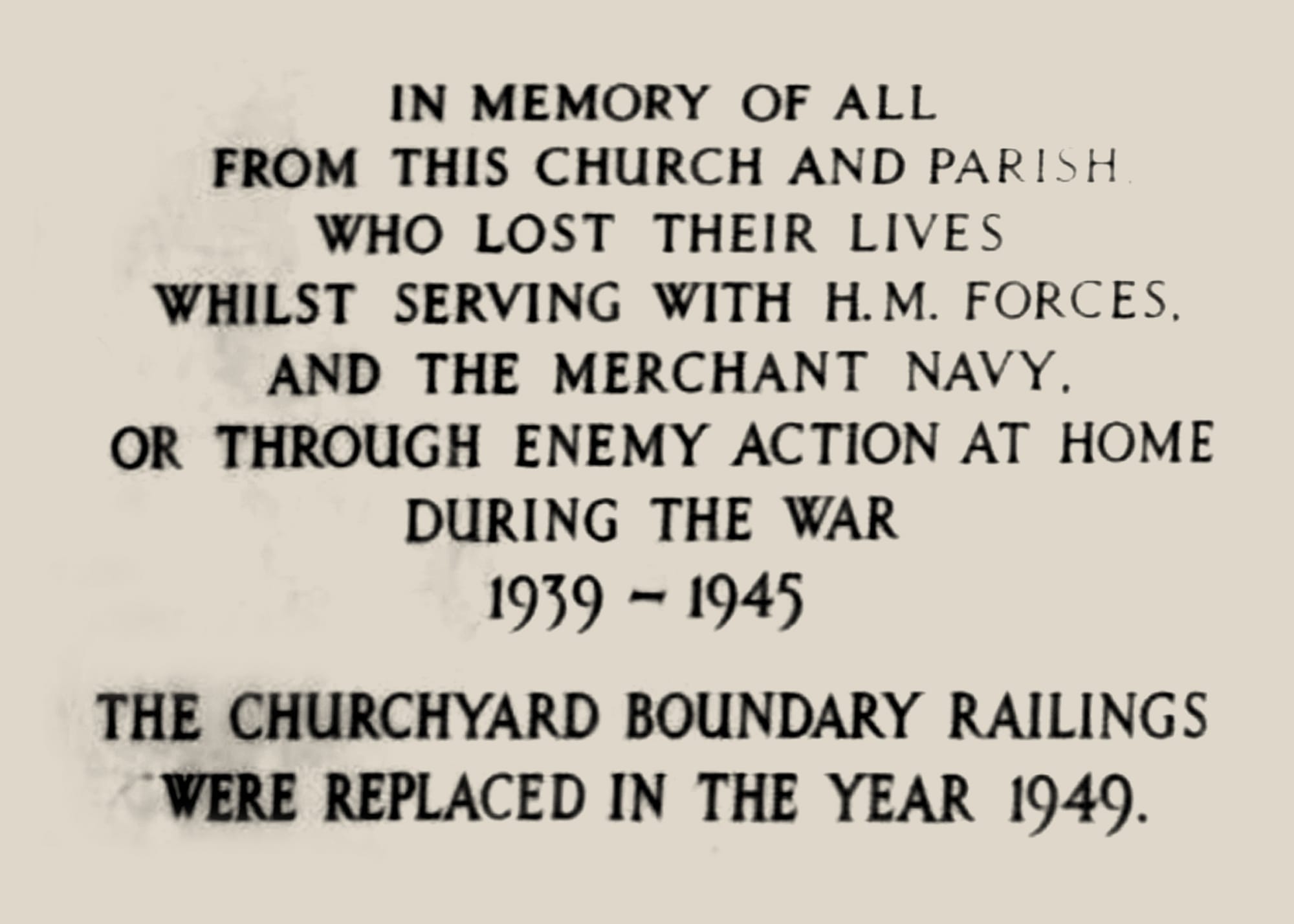 When viewed through the prism of today’s sensibilities, some of these commemorative gestures seem almost shockingly modest. In memory of the fallen of the Second World War, some churches chose to install new lighting. One church in Lancashire honored its recent war dead with a memorial bookcase; another church in Hampshire unveiled a Second World War memorial notice board. A plaque announcing new memorial railings at St. James Church in Higher Broughton, Salford, reflects just how anti-monumental and utilitarian these memorial gestures had become.