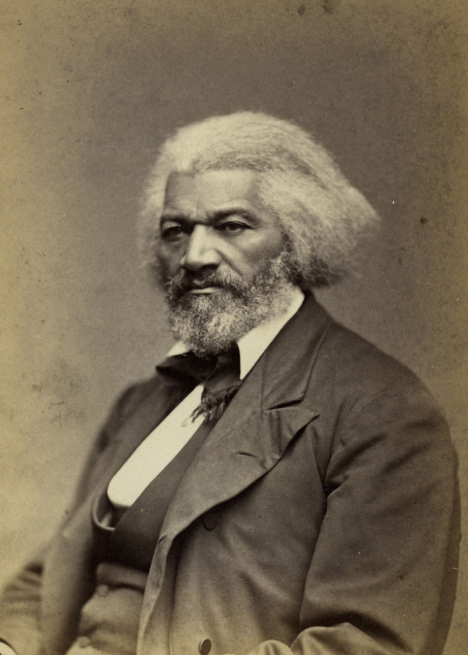 This portrait of Douglass was made in 1879. He does not look into the camera, as he so often did, but instead he gazes towards the floor in reflection. His costume is refined, his hair brushed confidently back and he conforms to an almost-Gladstonian image of the dignified, serene public servant.