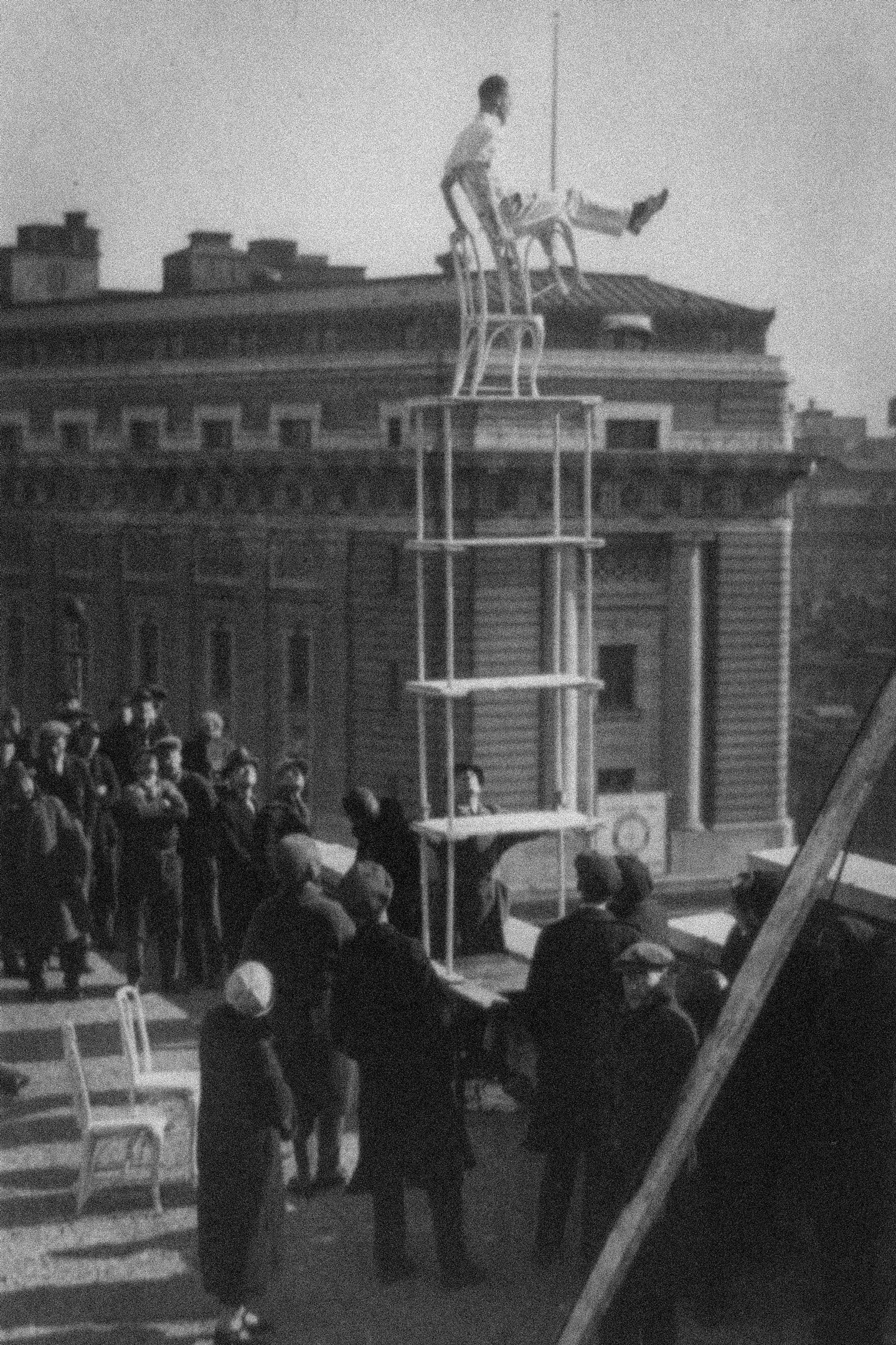Then he balanced on the top two tables, placing first the chairs with the fronts together, and then placing one on top of the other and swinging out over the roof at a dangerous angle.
