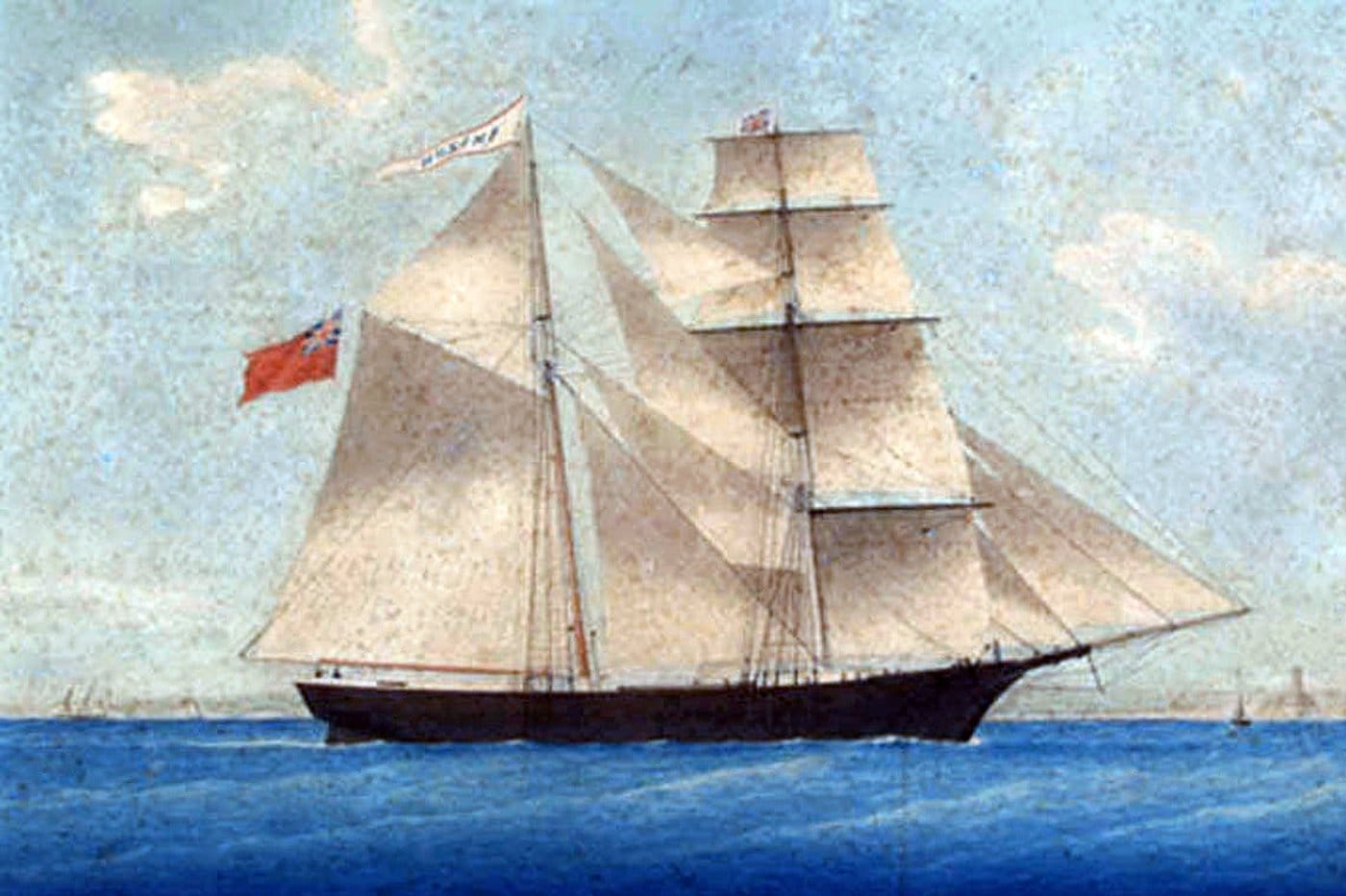 When the Dei Gratia first sighted her, the Mary Celeste was sailing on the starboard tack under jib and fore staysail and the wind was blowing from the north. Meanwhile, the Dei Gratia was progressing on the opposite tack under a more conventional press of canvas. Intrigued by how the brigantine lurched through the water, several hands were sent across from the Dei Gratia to investigate. They found that there was not a soul aboard the brigantine, nor was there any obvious cause for her abandonment.