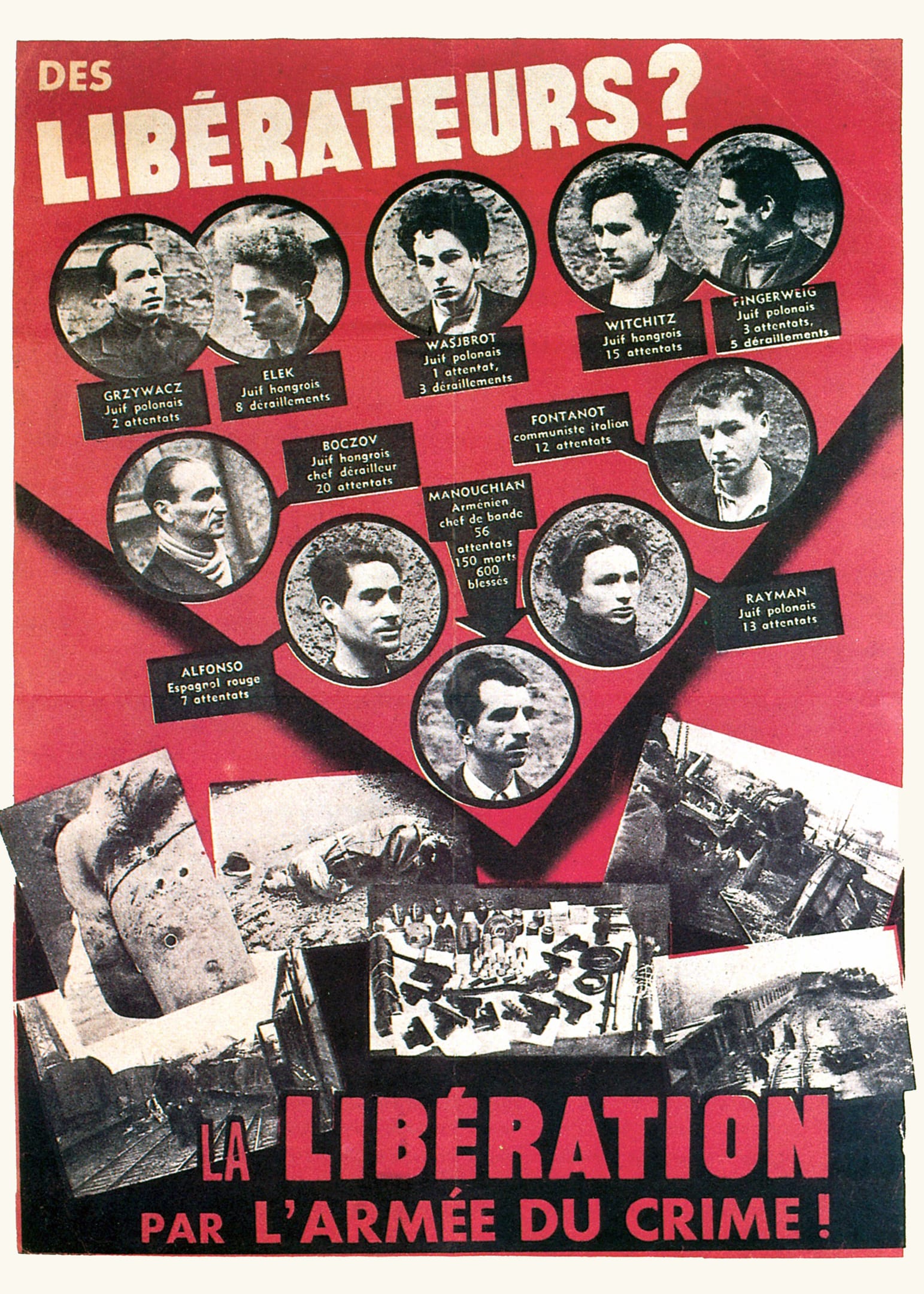 He then was part of this group, the FTP, who were really effective. They were betrayed, rounded up and shot but a poster that the Germans put up, presenting them as terrorists had exactly the opposite effect on the general population. It ridiculed their claim to be freedom fighters: But in fact, the 'red poster' as it became known as it was printed in blood red ink had the opposite effect. It’s very, very striking. You see these raggedy, wild haired young men, glowing with defiance just before they were shot. They are staring death in the face and they look very proud. It brings tears to my eyes when I look at it.