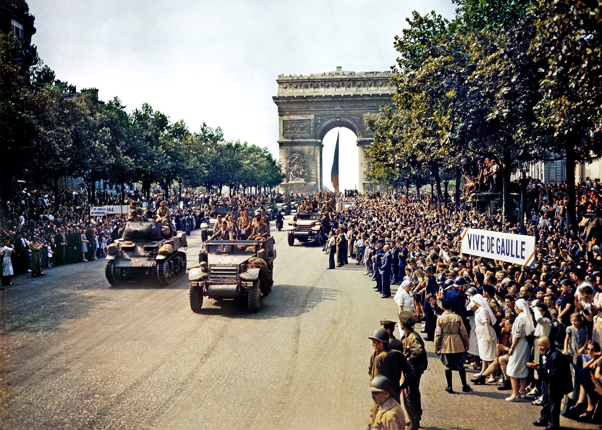 Almost every one of those statements is untrue. French troops were the first into the capital. But that was only because Eisenhower allowed them to do that. All their equipment was American. And the uniforms? they were American. They were backed up by the American Fourth Division. France itself had never as a whole played any part in this event. And this France that fights? Well actually that image was very much tarnished by the experience in 1940 where they hadn’t fought at all, certainly in terms of protecting Paris.