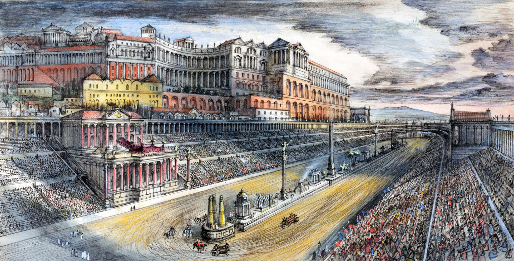 Your book includes a fabulous double page illustration of a chariot race taking place inside it. Can you tell us a little about its particular history?
