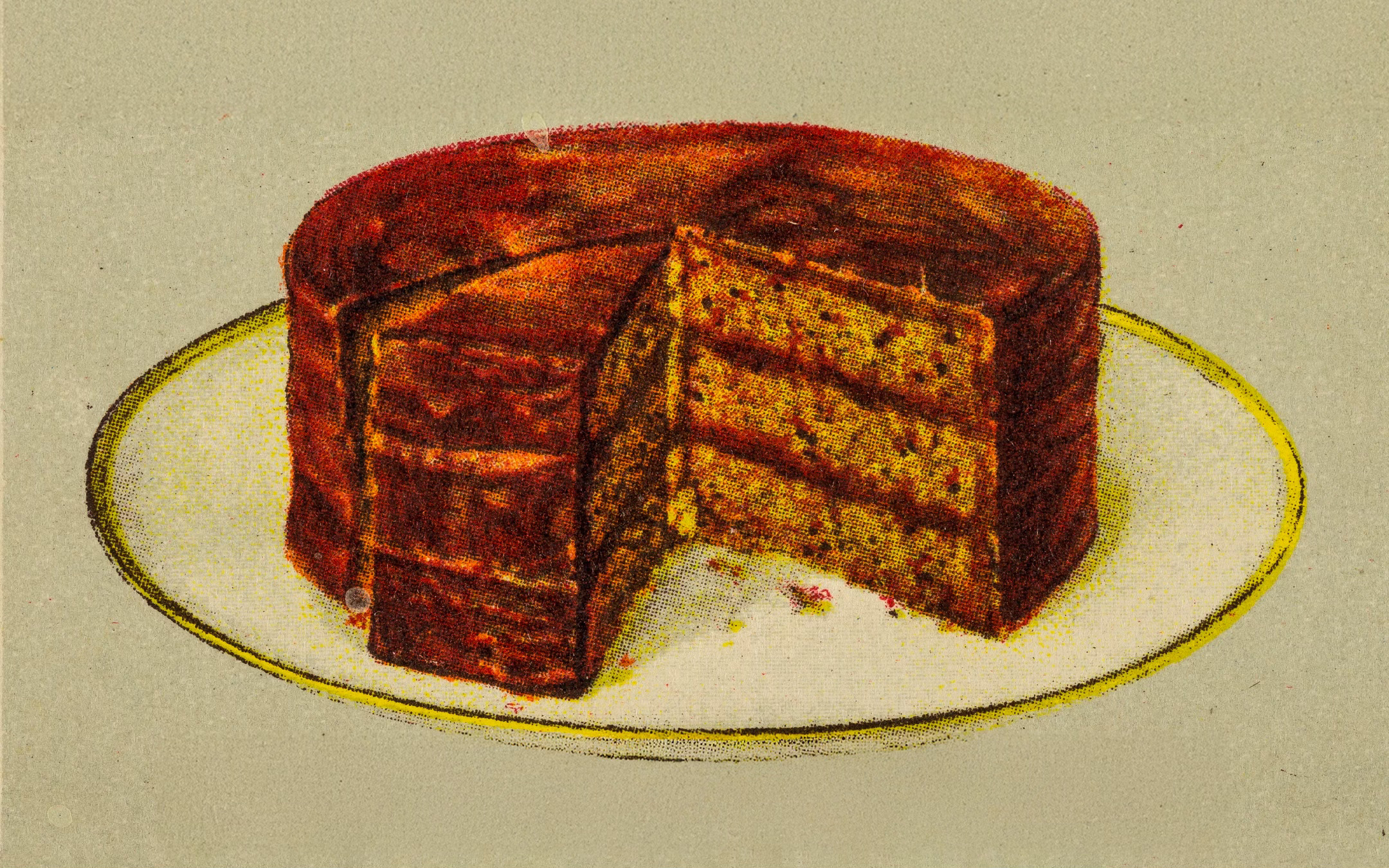 Out of this research came her own fleeting exhibition inspired by Alice’s: ‘100 English Cakes’. It has left almost no trace. The objects, of course, all being edible and therefore perishable, did not survive. I’ve not been able to find any photographs of the exhibition, and there is barely any other evidence.
