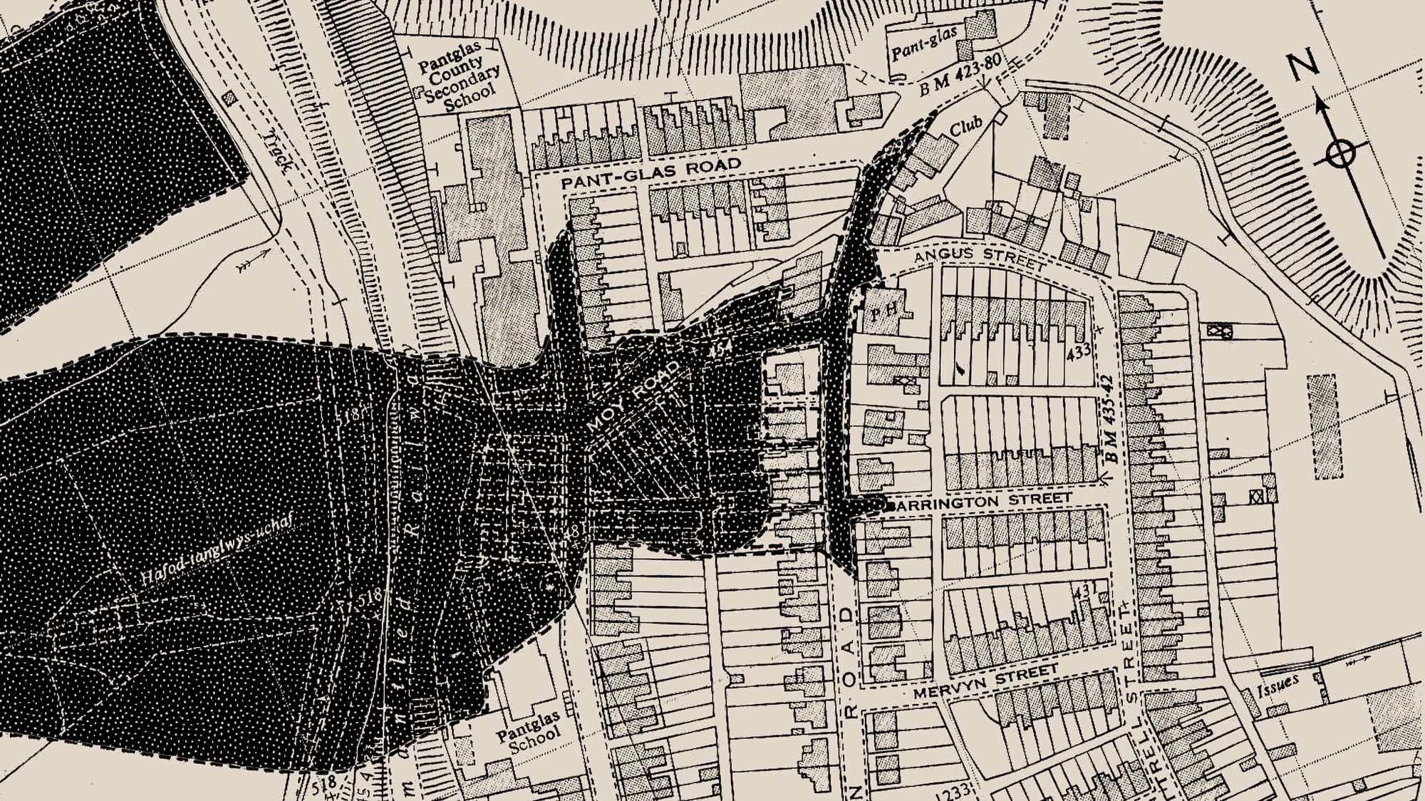 Sheep, hedges, cattle, a farmhouse with three people inside were smothered. The westernmost street in the village, which lies against the mountainside, is Moy Road. It was where Aberfan's two schools were situated: Pantglas Junior School and Pantglas County Secondary School. Classes at the junior school began at nine o'clock. The senior school got going at nine thirty. The wave reached them at nine fifteen, burying the primary school, which was full of children answering the register, checking the rain gauge, spelling the word p-a-r-a-b-l-e, paying their dinner money, delivering school sports reports, preparing to draw. Colliery trams and boulders crashed through the walls. The rear of the school was crushed beneath a dark heap thirty feet high. The gable ends of the roof poked through the waste. The senior school was only partially hit.