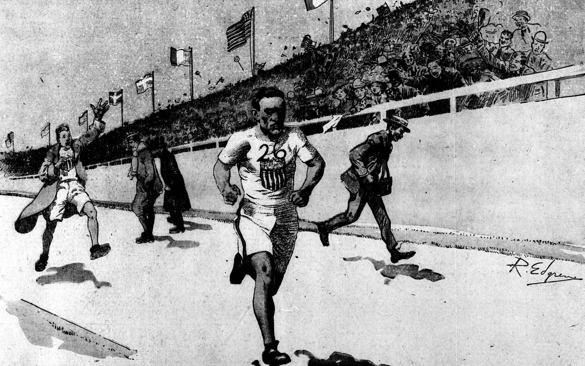 ‘But it was still merely a feeble nerveless walk’, one spectator wrote. ‘The ghost of a sprint – so slow that the short steady pace of the man on the other side of the arena seemed rapid by comparison. The feelings of the spectators [were] beyond description. They saw the Italian, now on the home stretch and only a short distance from the goal, going slower and slower, like a mechanical doll, suddenly run down, and his rival gaining steadily every second.’