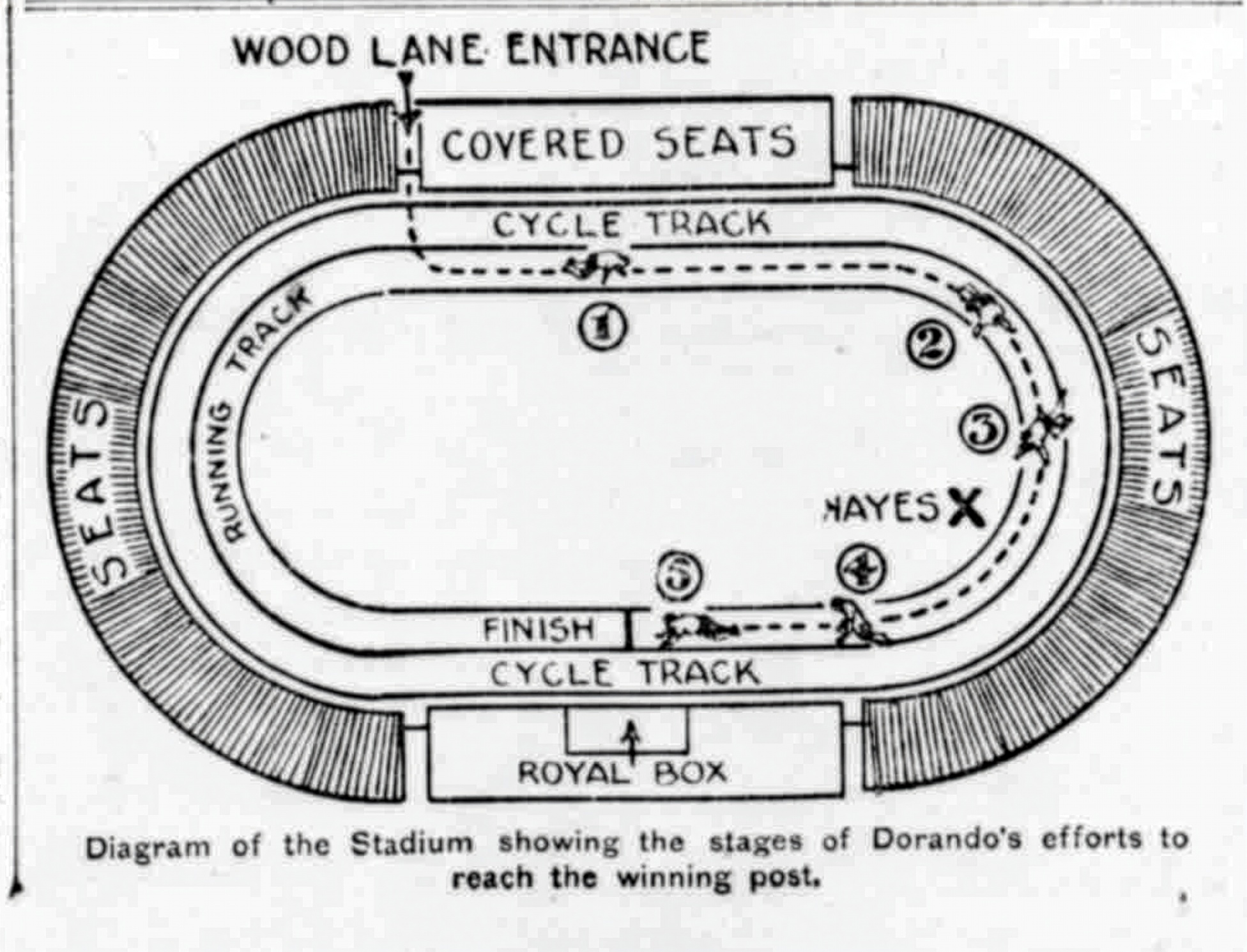 The drama began when, shortly after a great shout from the spectators on the stand overlooking the road, a tiny figure staggered through the gateway on Wood Lane. He was variously described as, ‘A gaunt little man with burning eyes and livid features streaked with dust and perspiration;’, or a ‘strange little figure in deep red pants and a white jersey’. Although many in the crowd did not know it yet, this was Dorando Pietri, an Italian competitor.