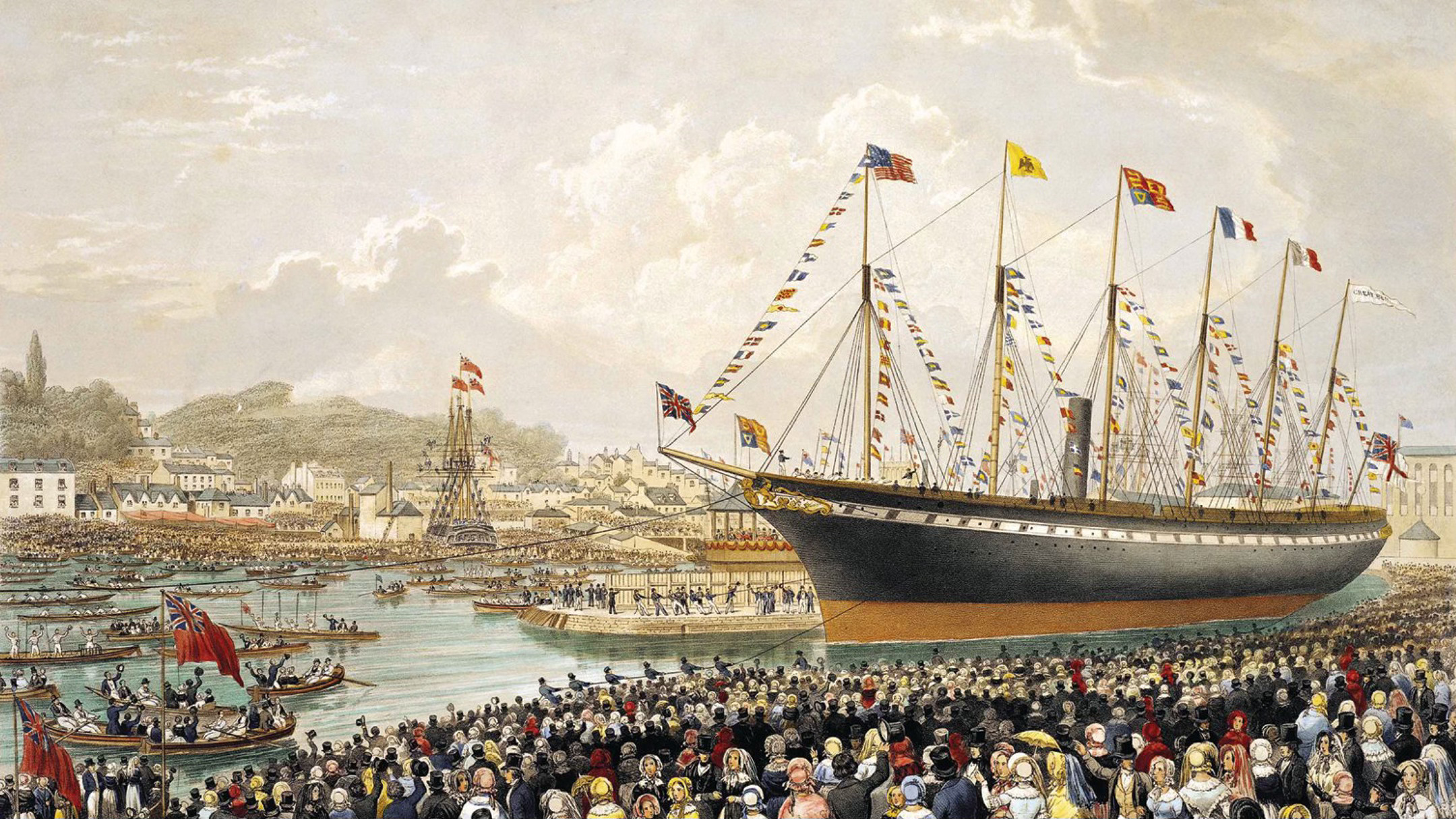 By first light on Tuesday morning the wind was beginning to freshen. Captain Thomas Taylor—an experienced sailor—ordered all the fore-and-aft sails in. Shortly after midday the ship was abreast of the British mainland at Holyhead and there was only a short coastal passage remaining. There, off the island of Anglesey, in the weak light of an unsettled autumn day, the passengers were able to gaze over the water towards the mammoth outline of Brunel’s SS Great Eastern, by far the largest vessel afloat.